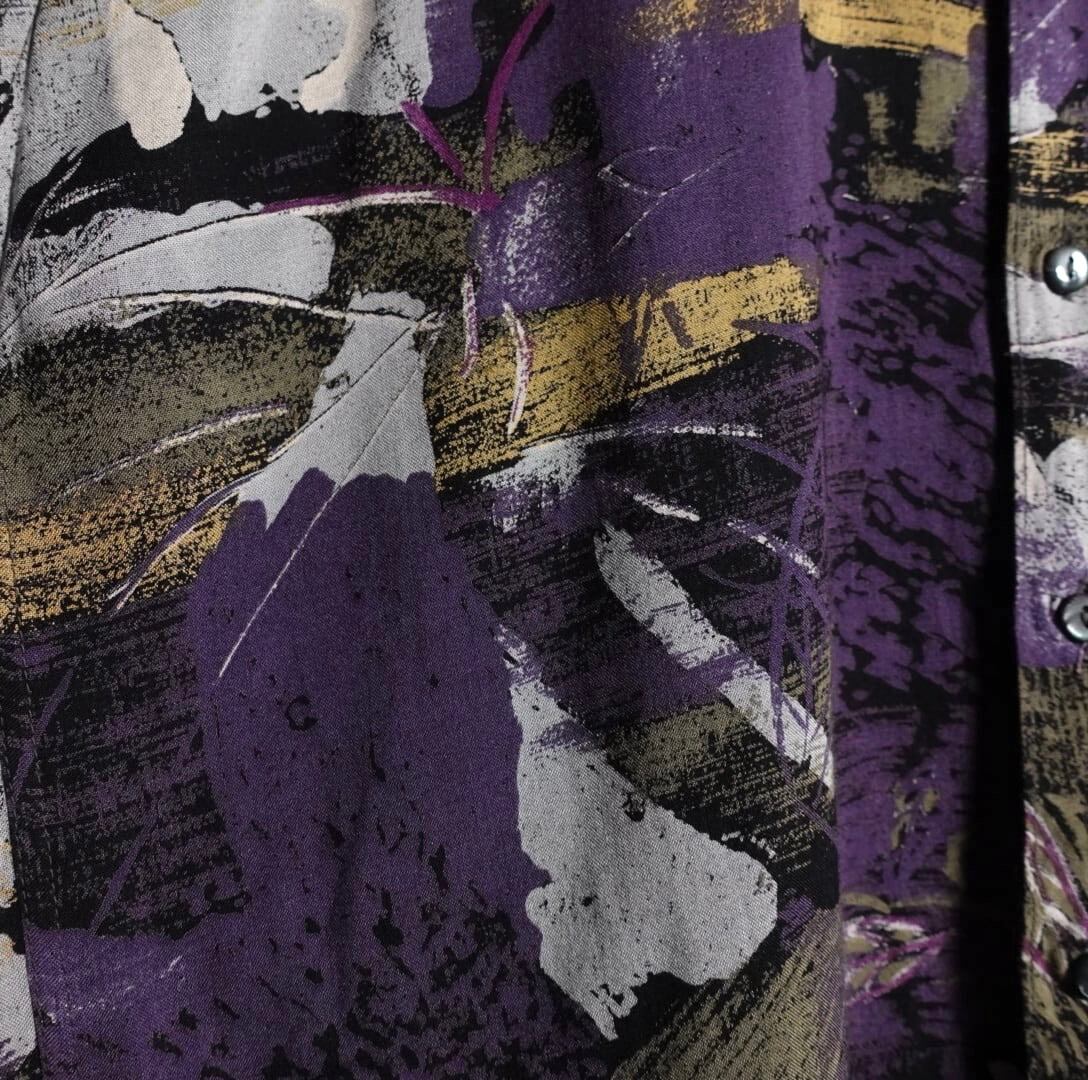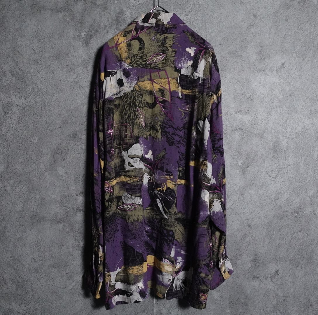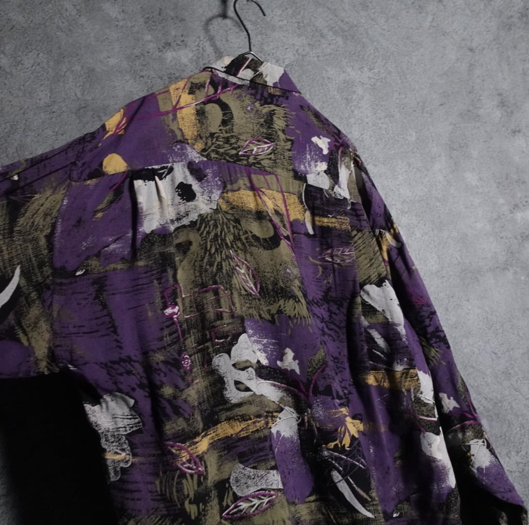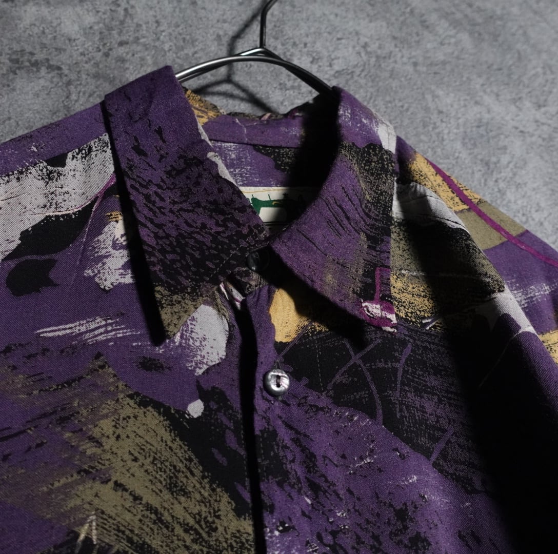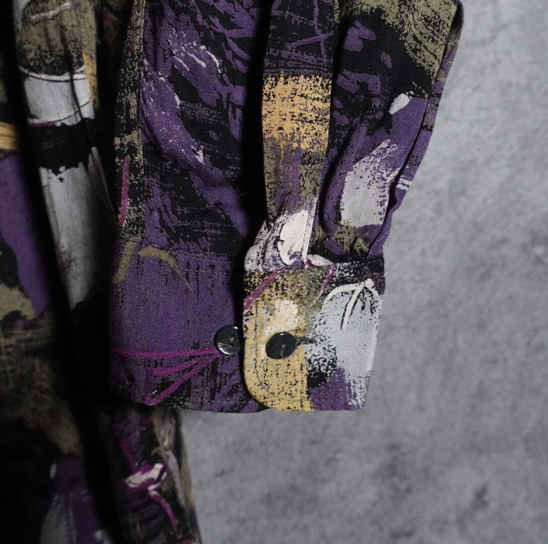パープルをベースにホワイト、ブラック、イエローの抽象的な柄を全面にあしらったアーティスティックなデザイン。