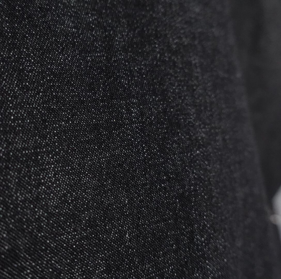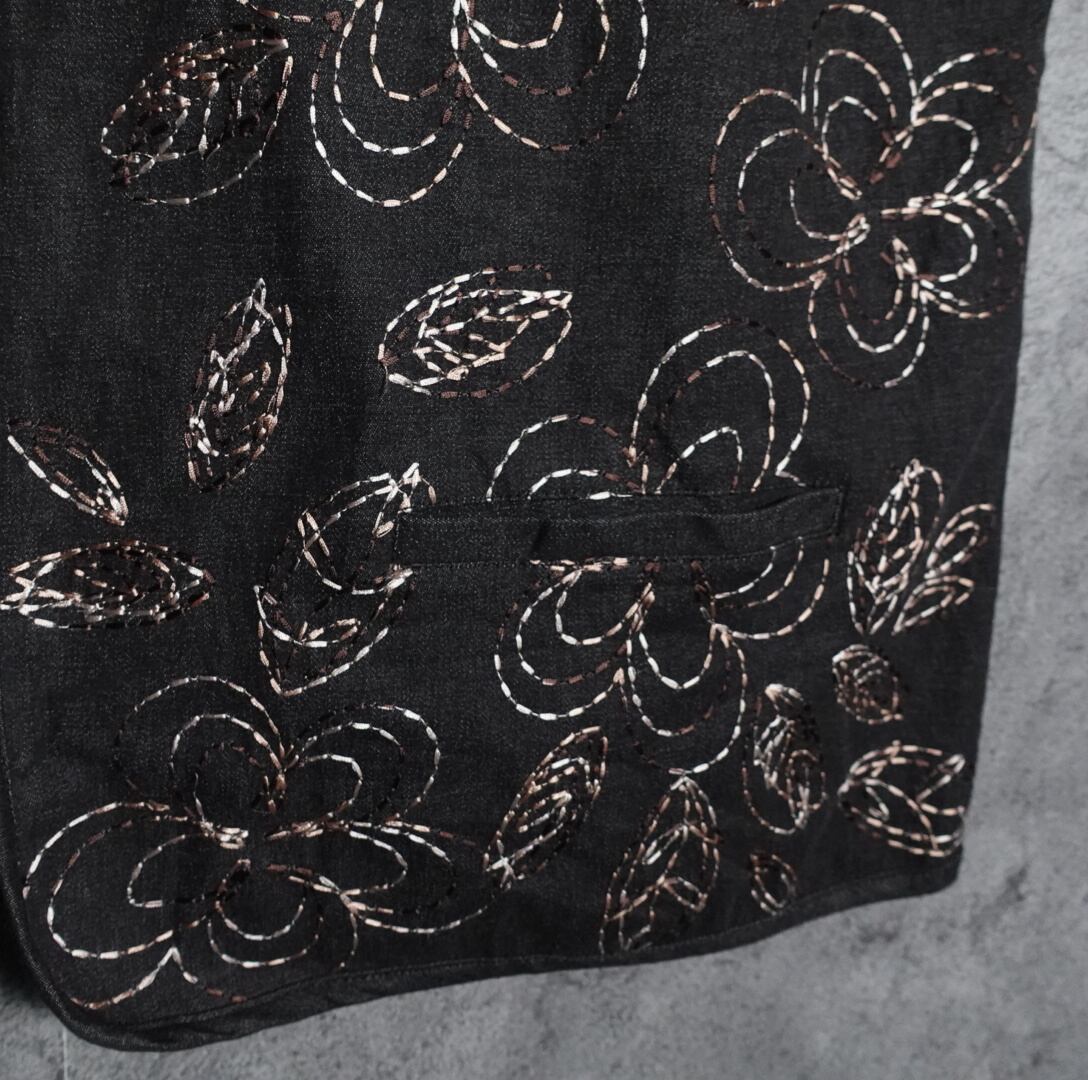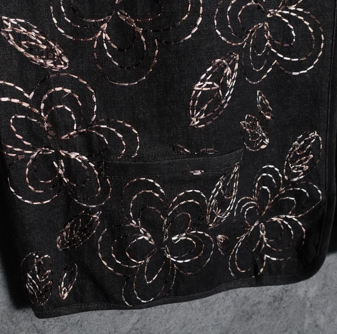 ブラックデニムに光沢感のある刺繍で花のモチーフを前面に施したデザイン。