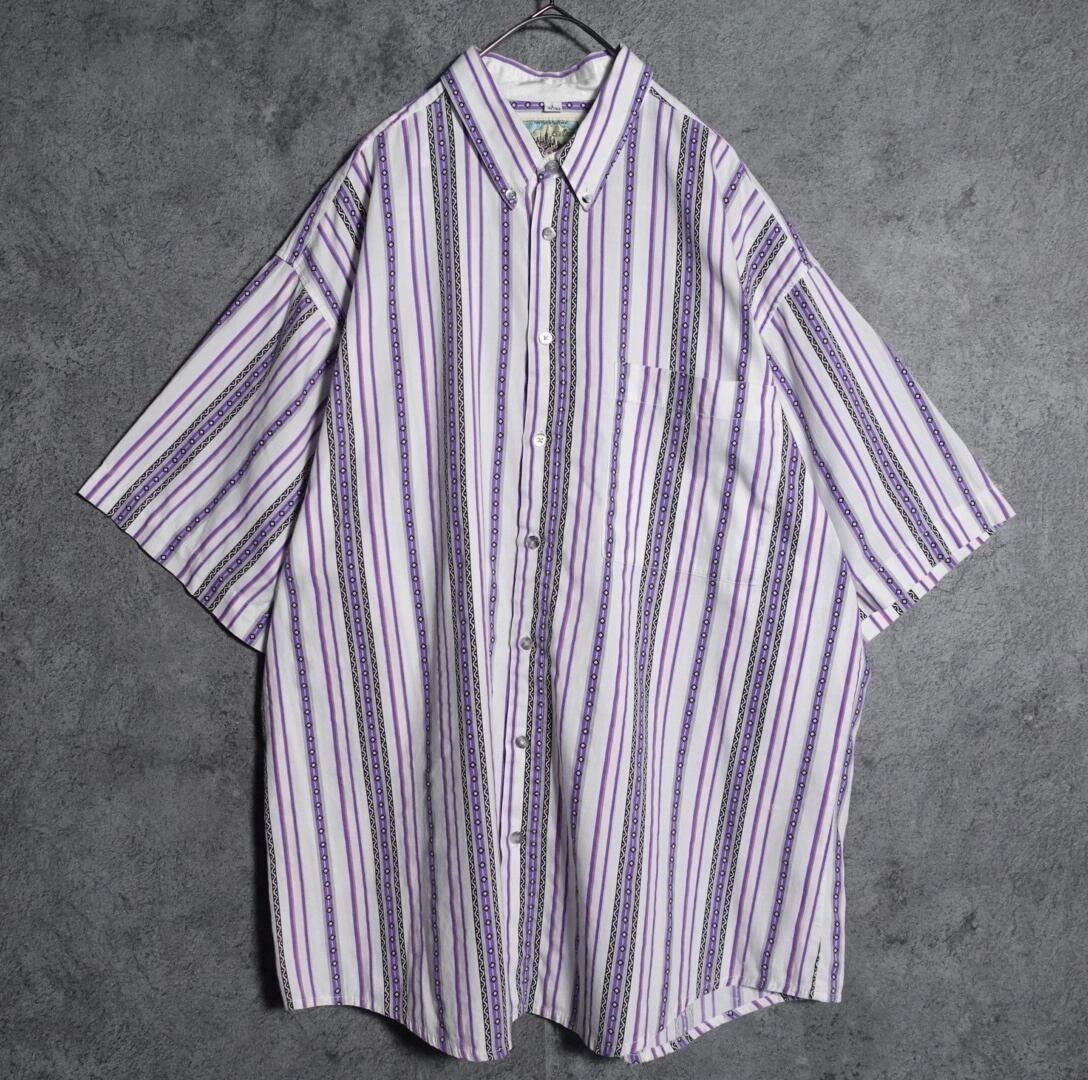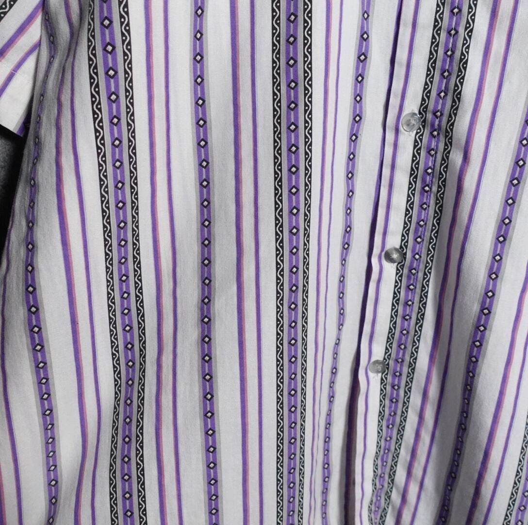 ホワイトをベースにパープル、ブラックの幾何学的な柄のストライプをあしらったデザイン。