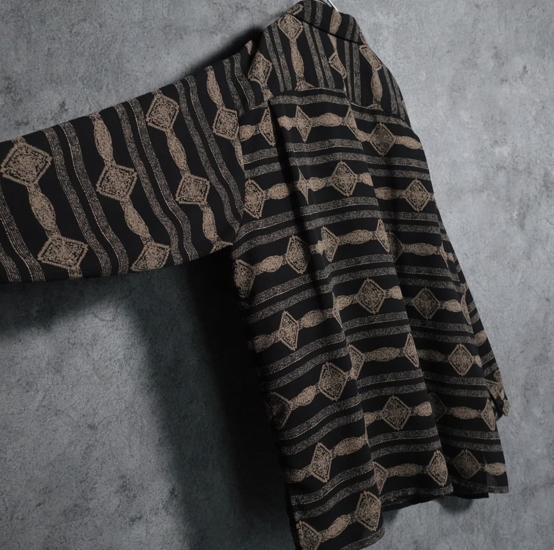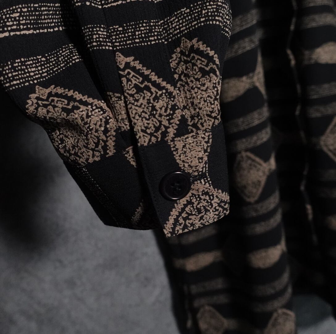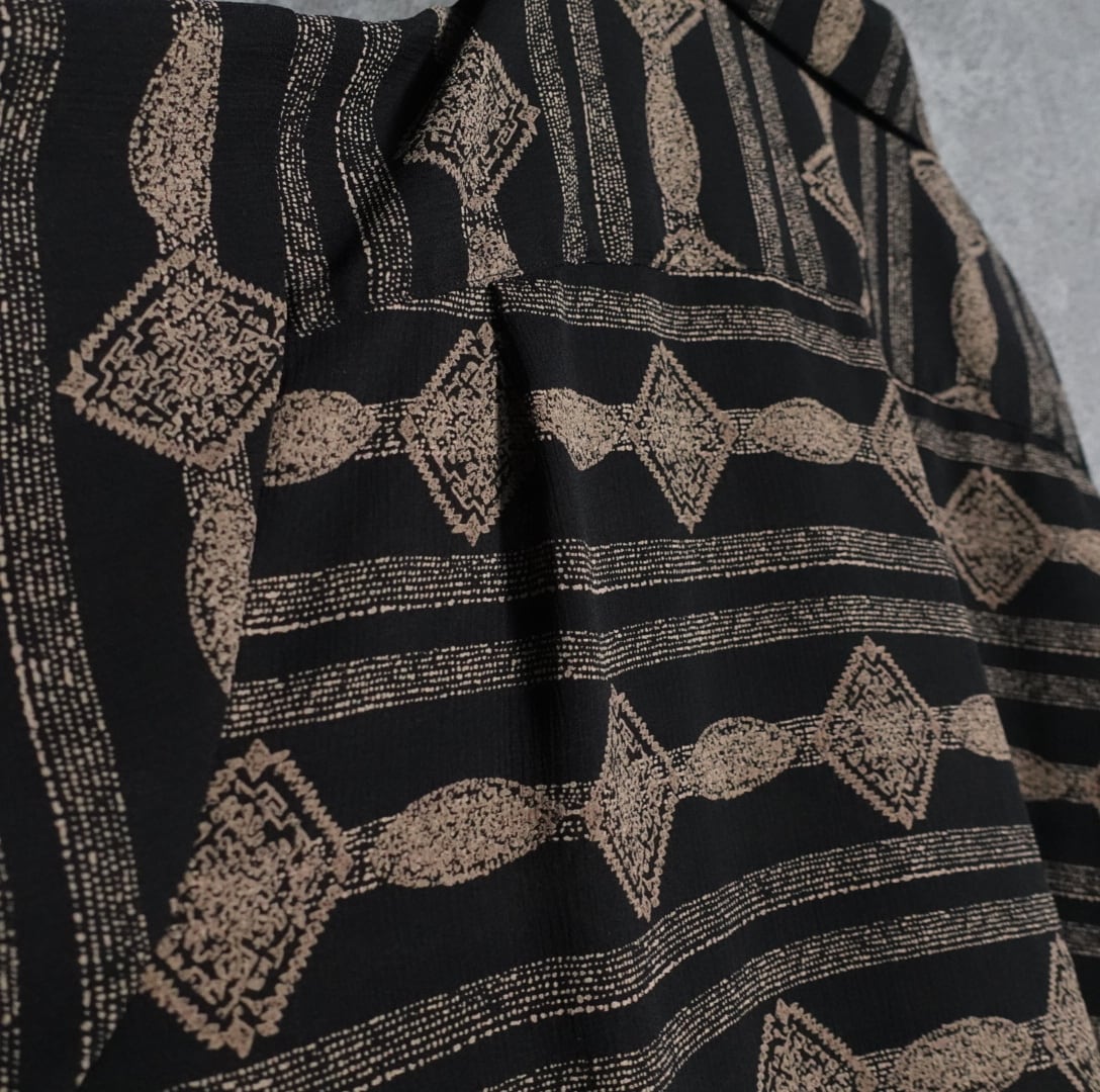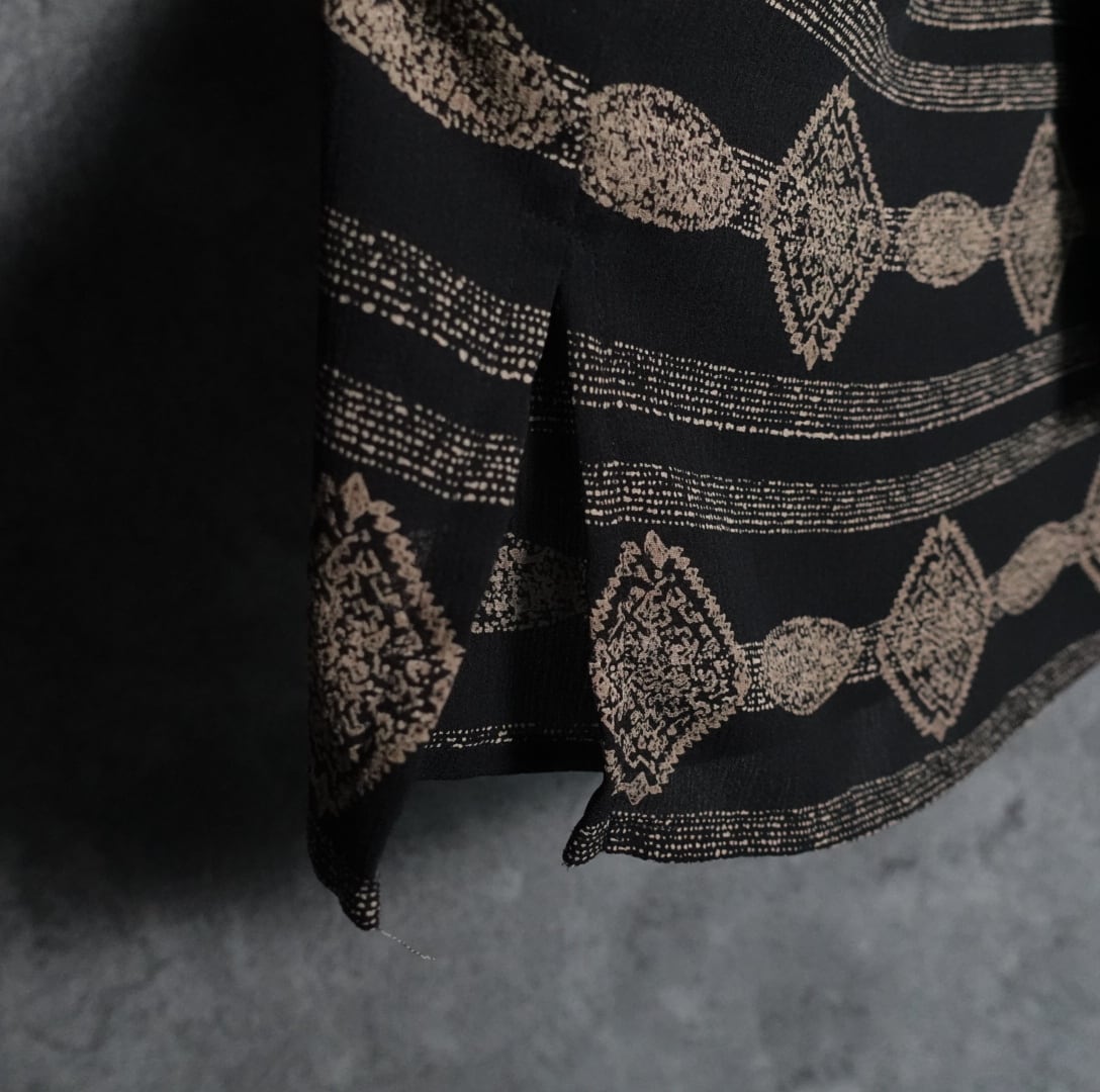 ブラックベースにベージュの抽象的なモチーフの柄をボーダー状に全面にあしらったデザイン。