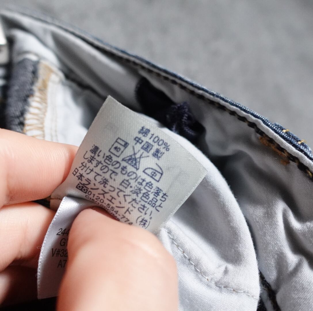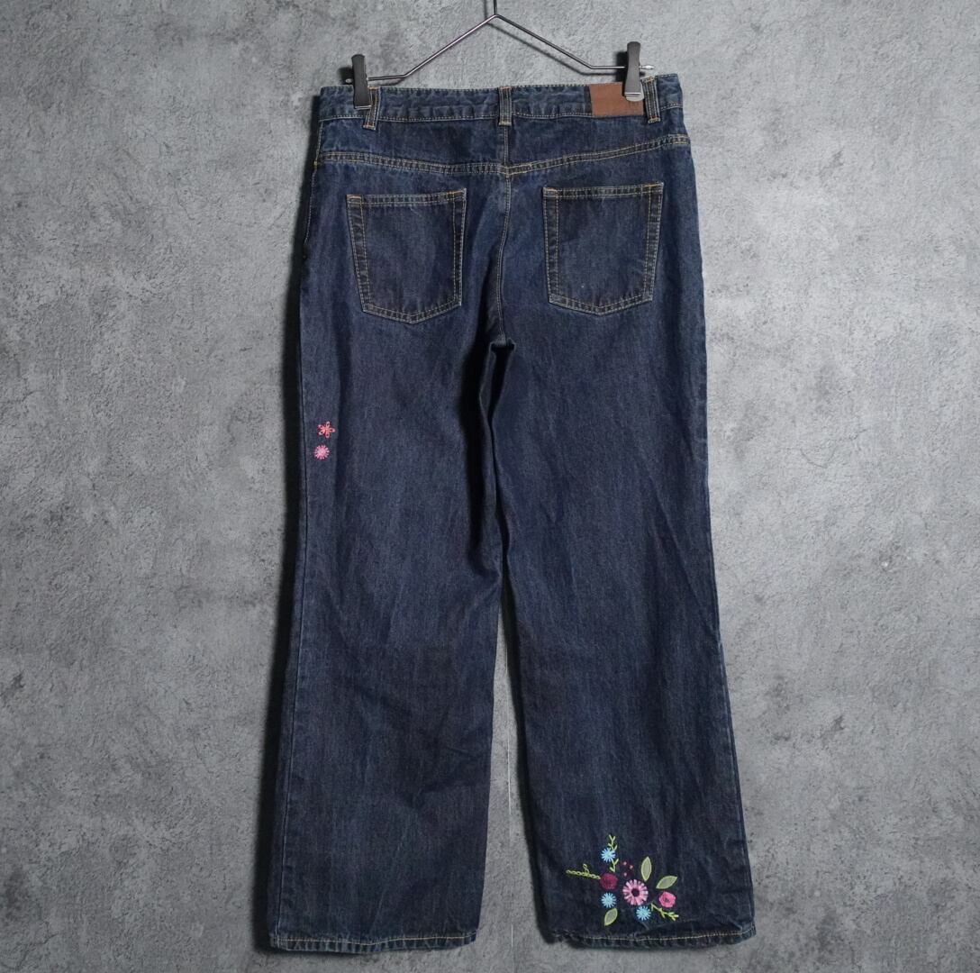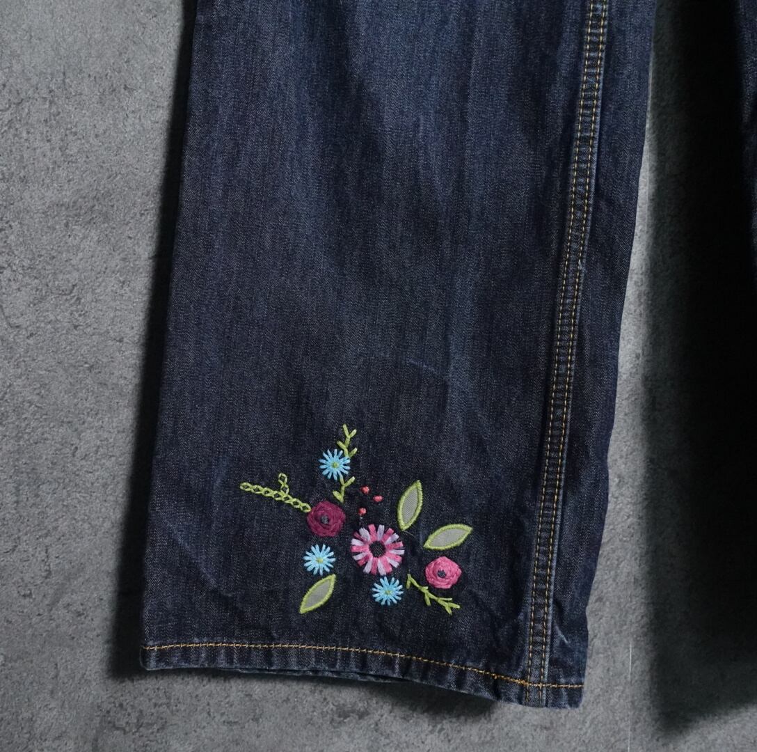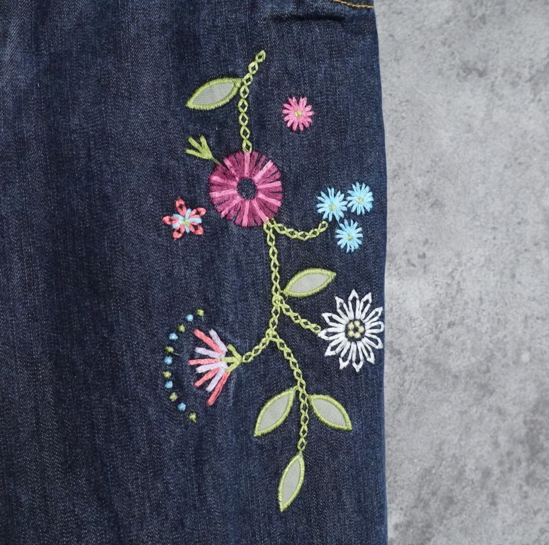 デニムパンツでは珍しい花のモチーフの刺繍を所々にあしらった洒落たデザイン。