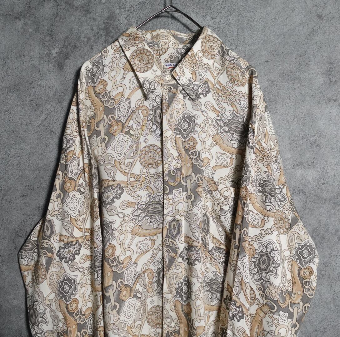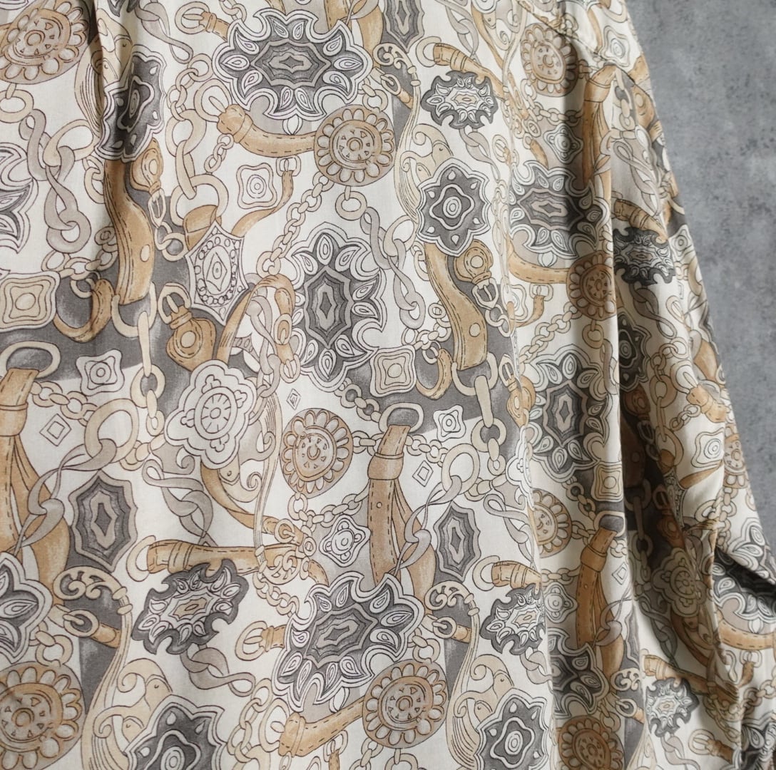 チェーン、ベルトモチーフのスカーフ柄を全面にバラバラにあしらったラグジュアリーなデザイン。
