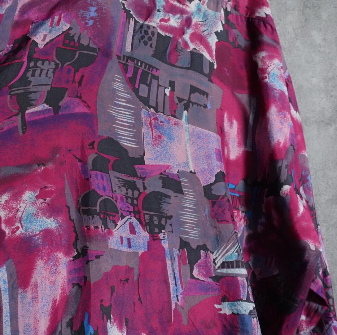 パープルをベースにブラック、グレー、ブルー、ライトグリーンのアーティスティック柄を全面にあしらったデザイン。