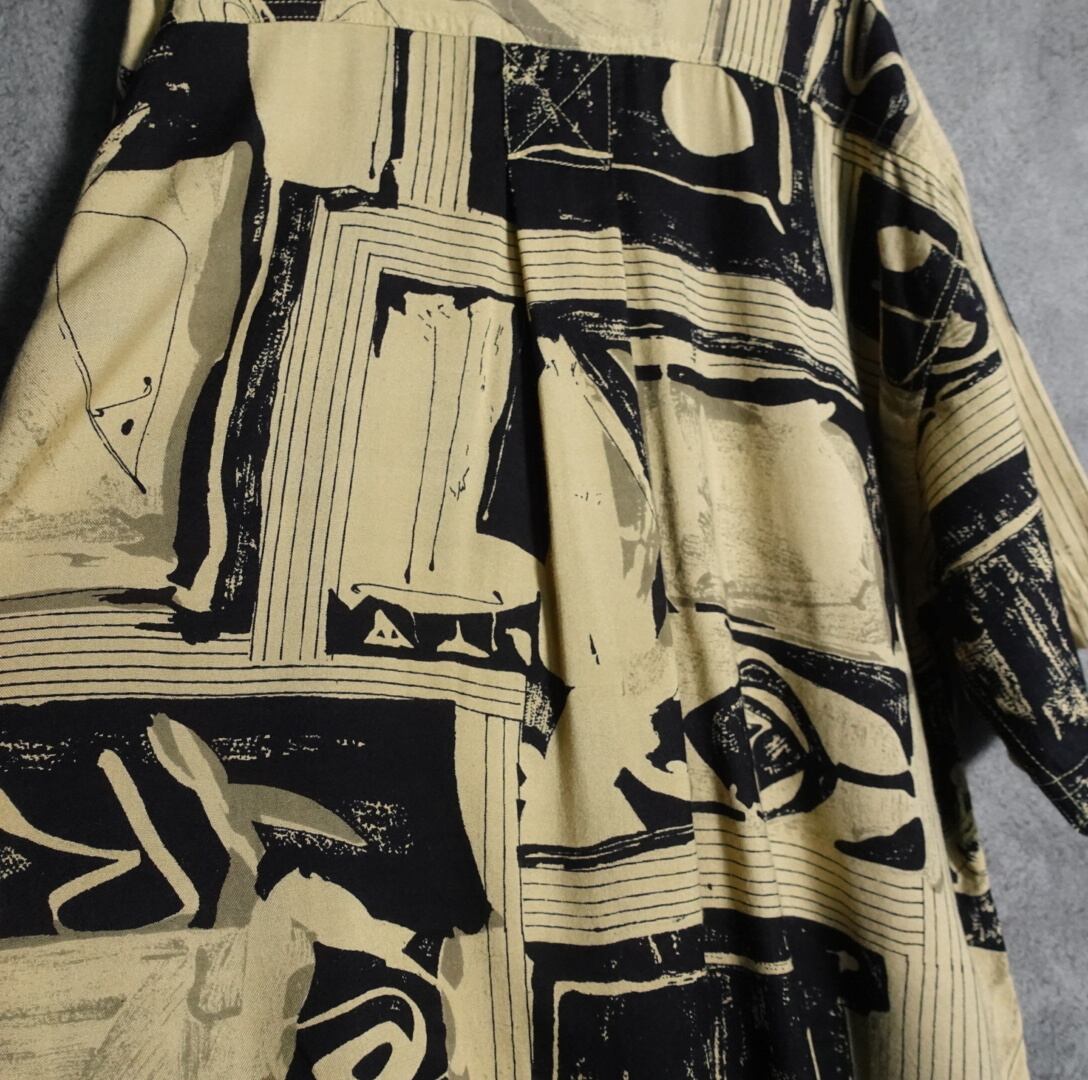 イエローをベースにブラック、カーキで魚のモチーフと抽象的なアーティスティック柄あしらったデザイン。