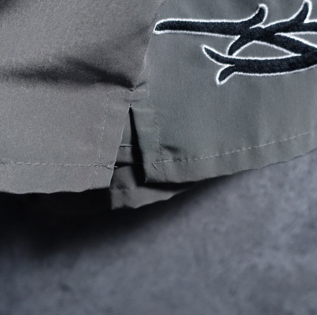 ブラック、ホワイトのトライバルモチーフの刺繍を両袖、前面の裾に施したデザイン。