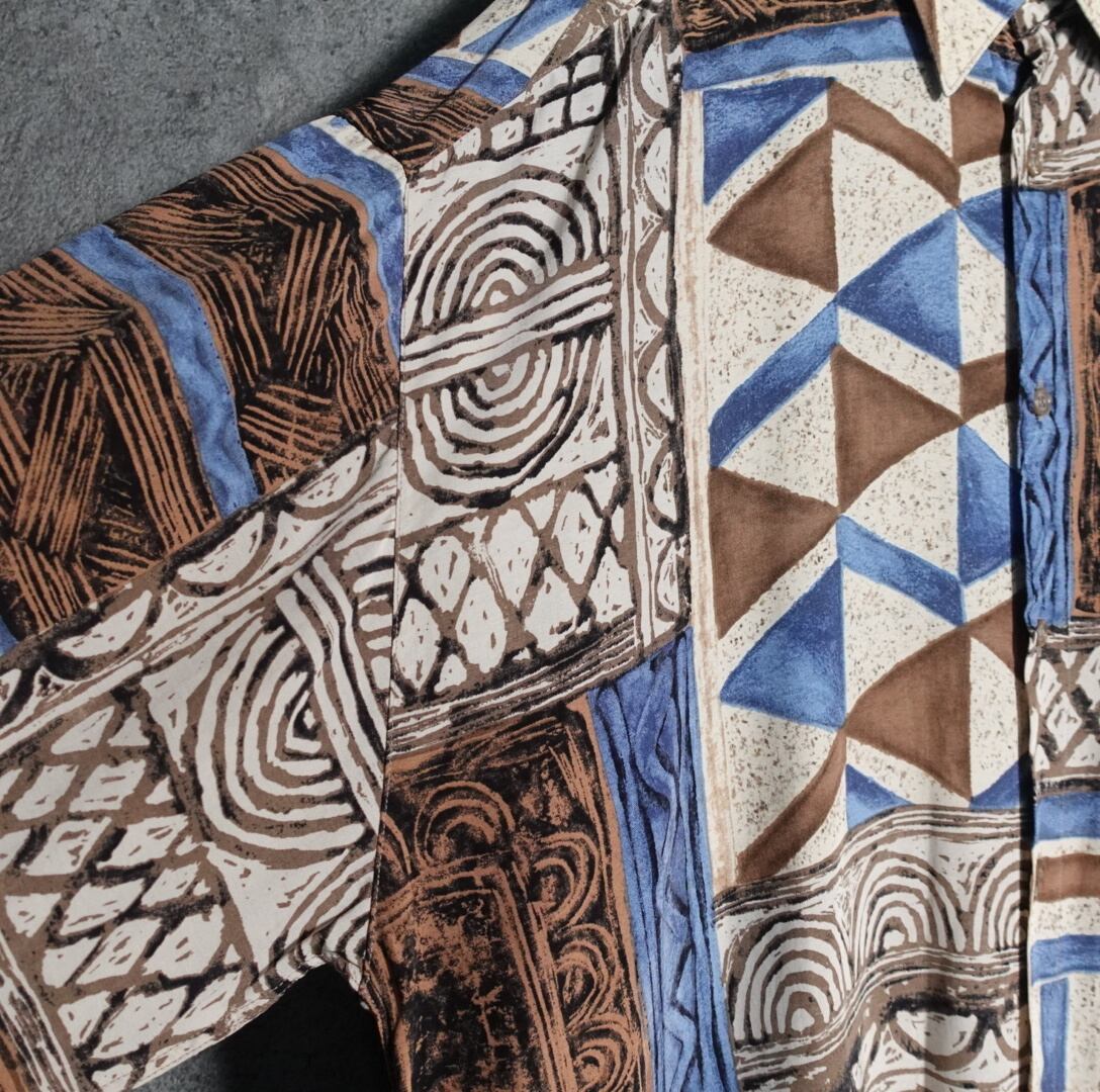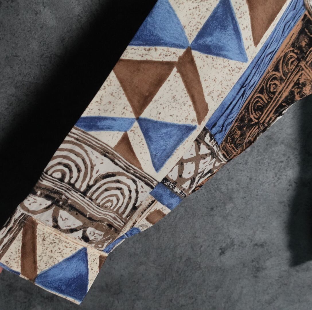 アイボリー、ブラウン、ブルーの様々な幾何学模様をバラバラに配置した凝りに凝ったアーティスティックなデザイン。