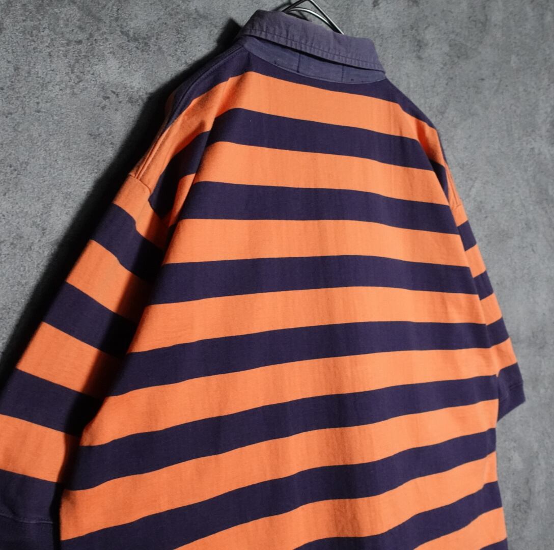ネイビー、オレンジの色鮮やかなカラーリングのボーダーをベースに、ブラックのポニーロゴの刺繍を施したデザイン。