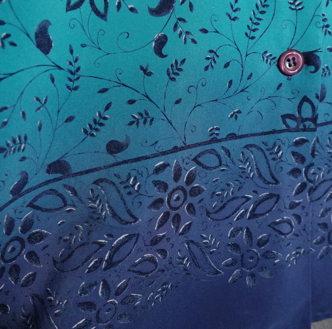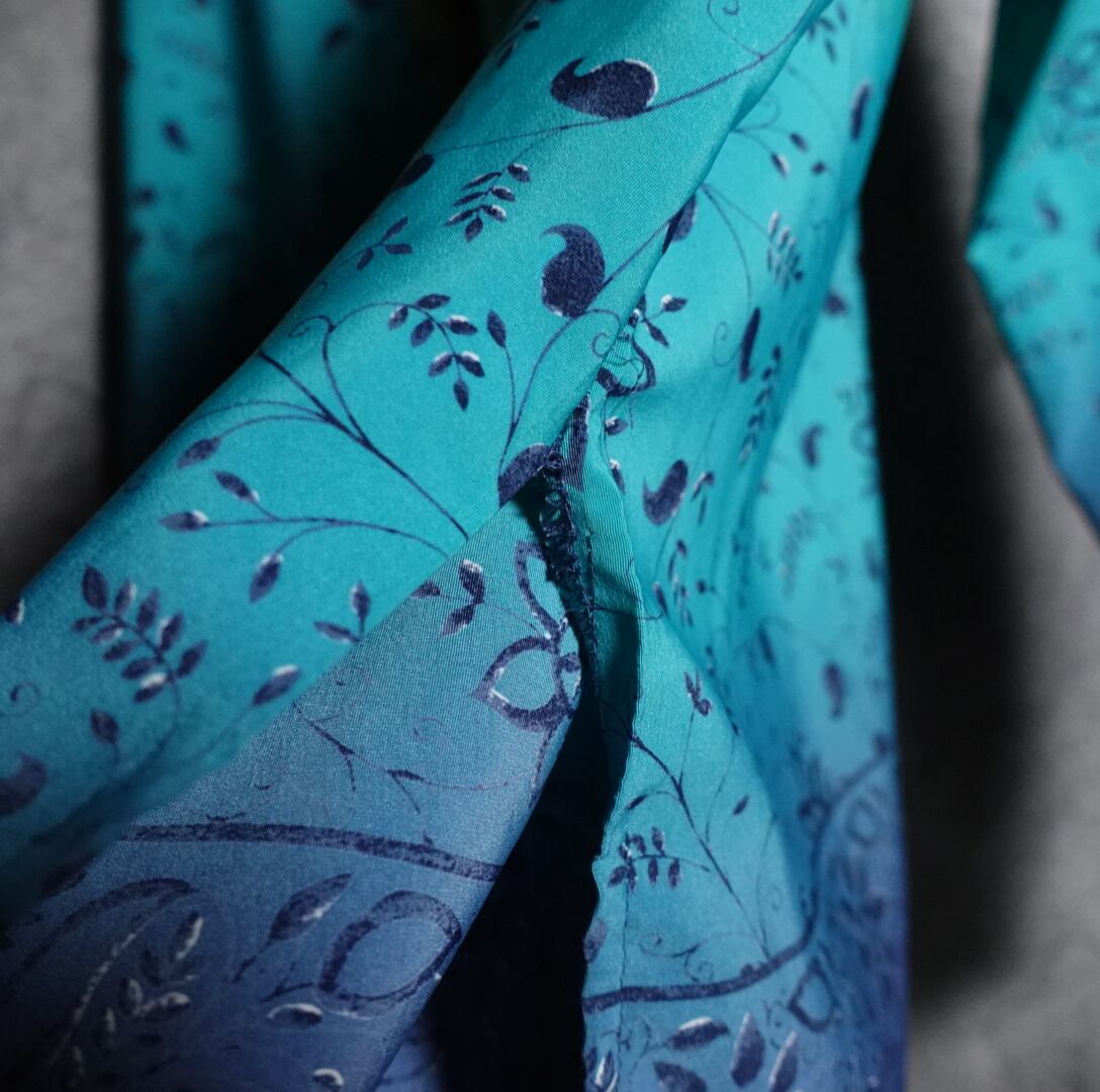 ライトグリーンからエメラルドグリーン、ブルーのグラデーションをベースにボタニカル柄を全面にあしらった美しいデザイン。