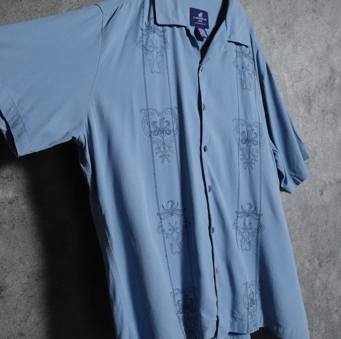 ライトブルーの刺繍デザインシルクシャツが入荷です。