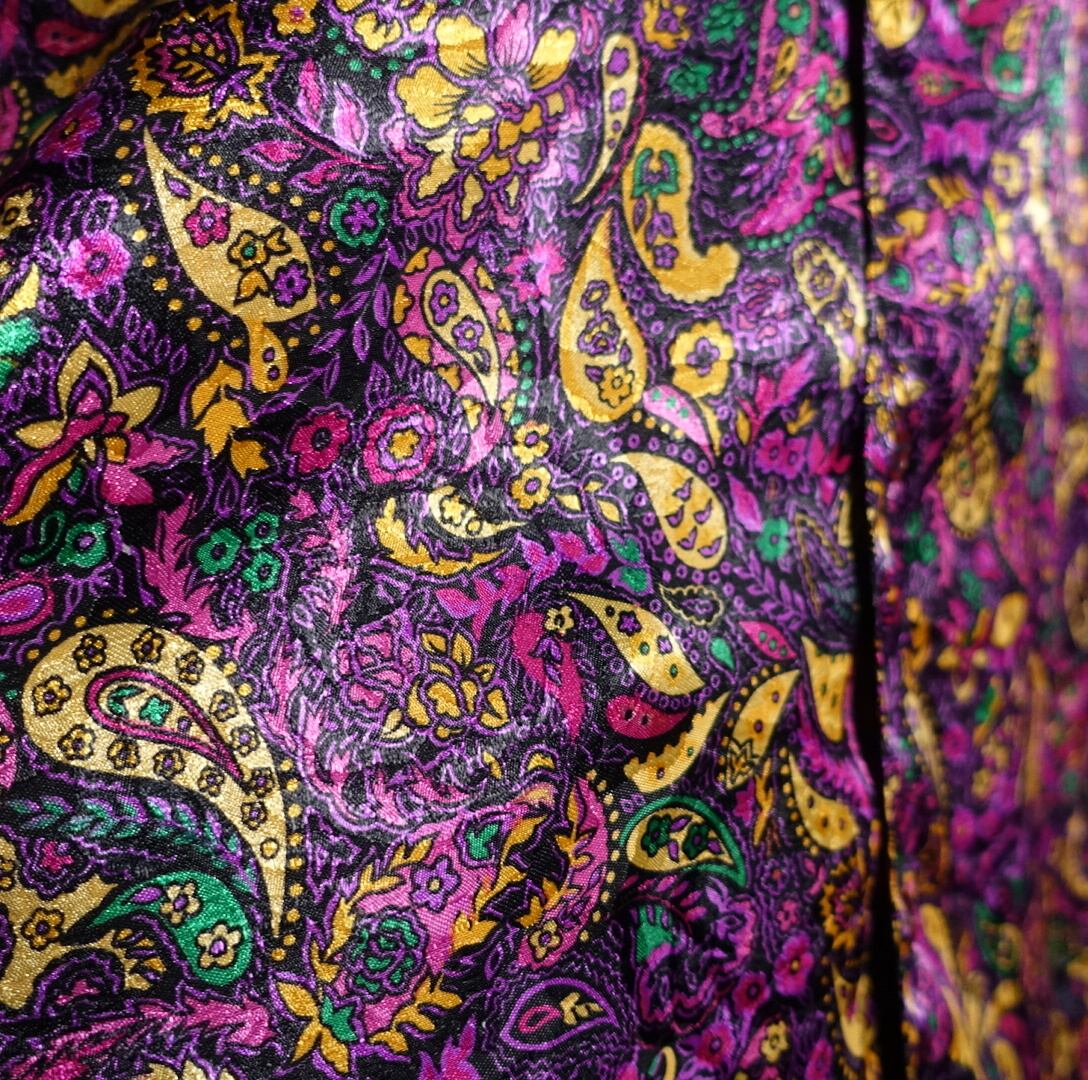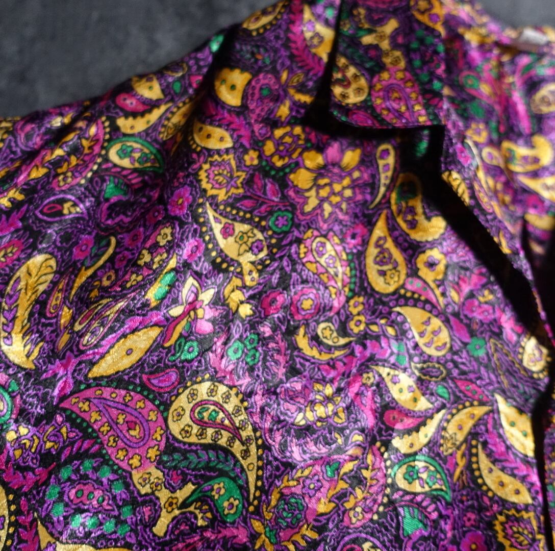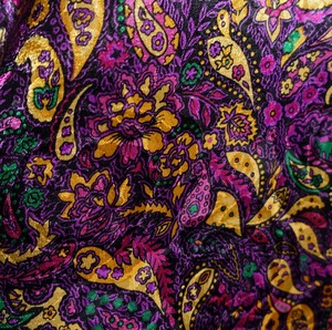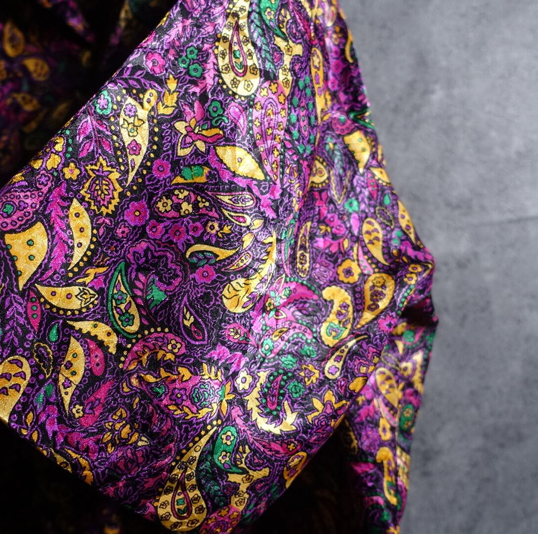 発色の良いパープル、イエロー、グリーンのペイズリー柄をびっしりとあしらったデザイン。