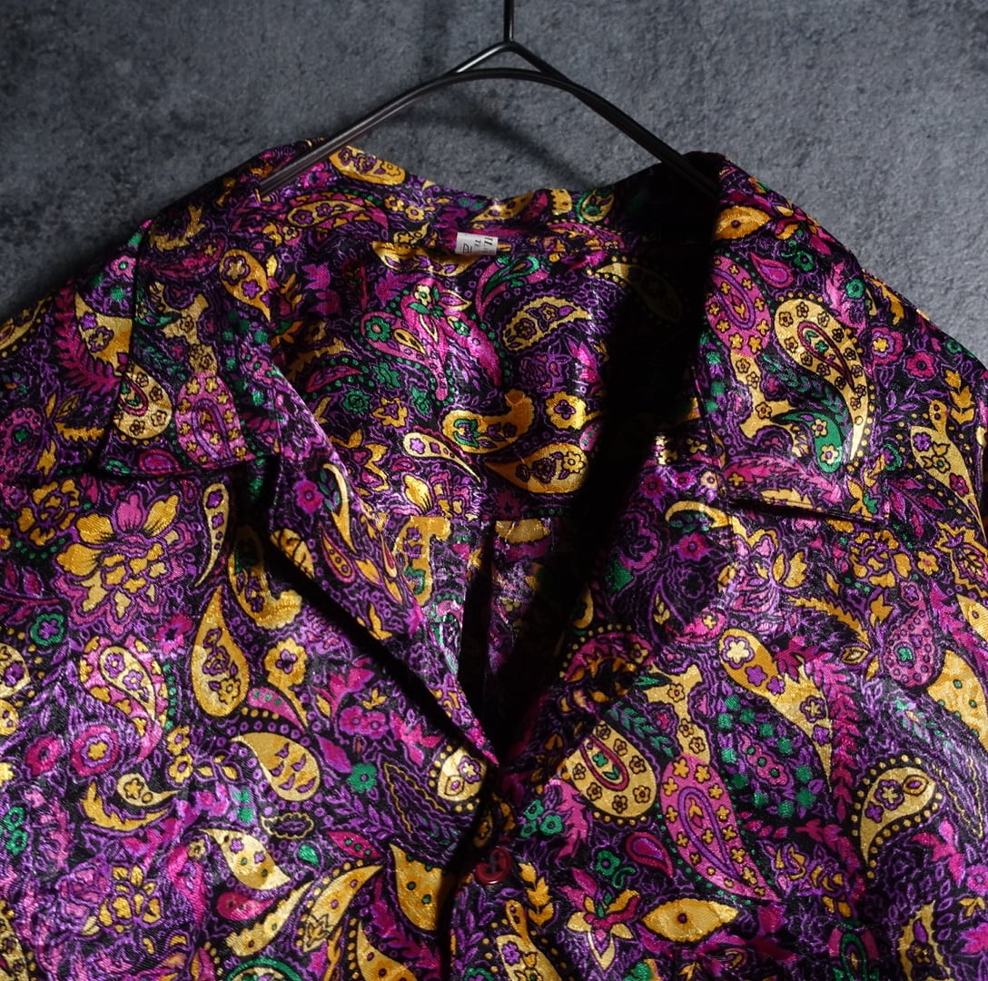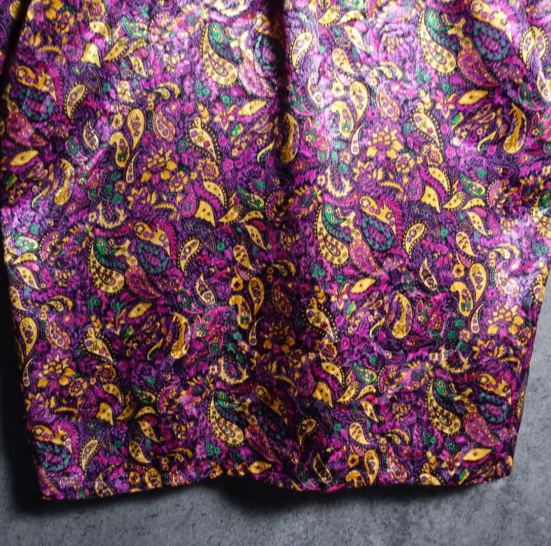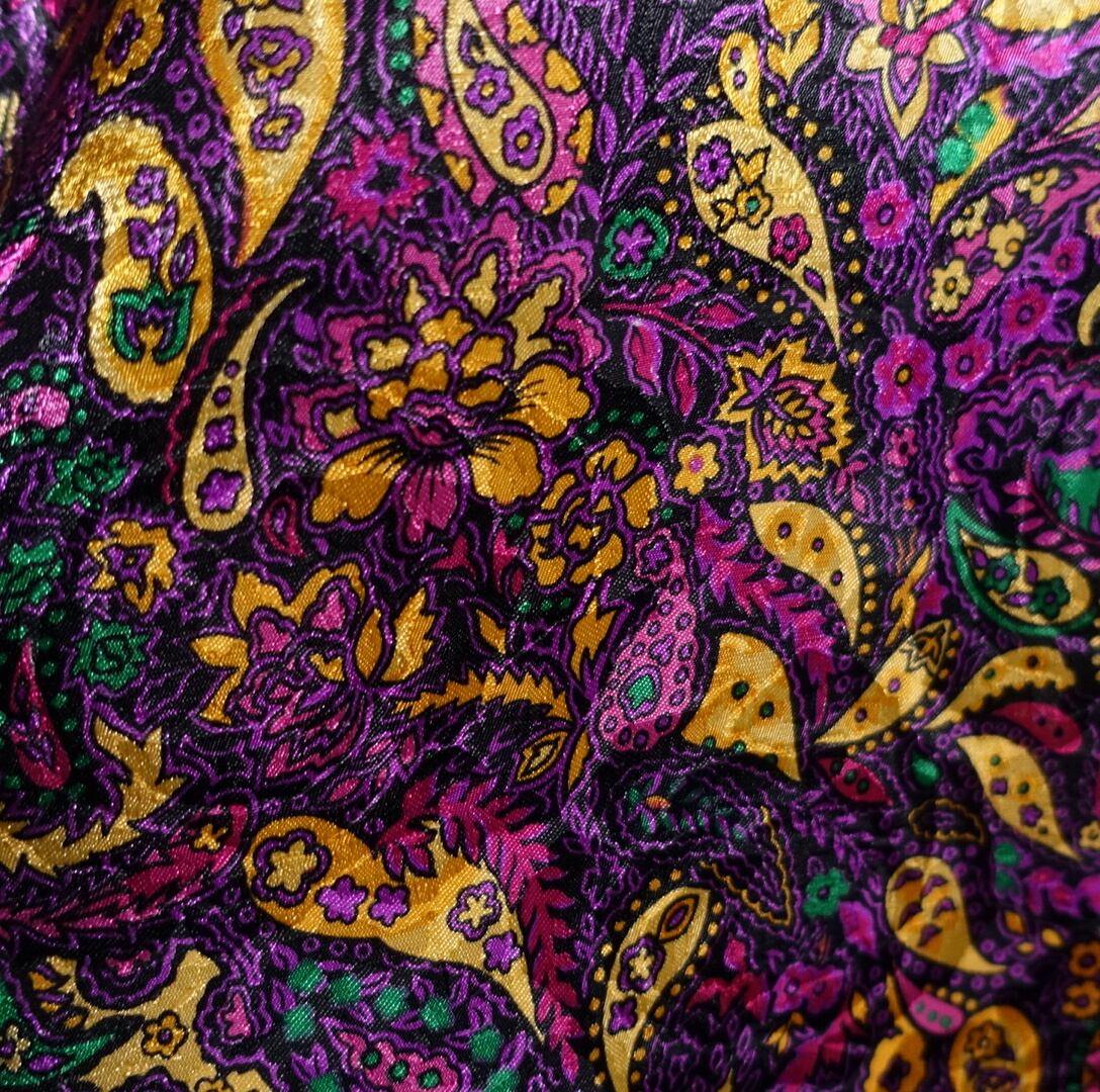 発色の良いパープル、イエロー、グリーンのペイズリー柄をびっしりとあしらったデザイン。