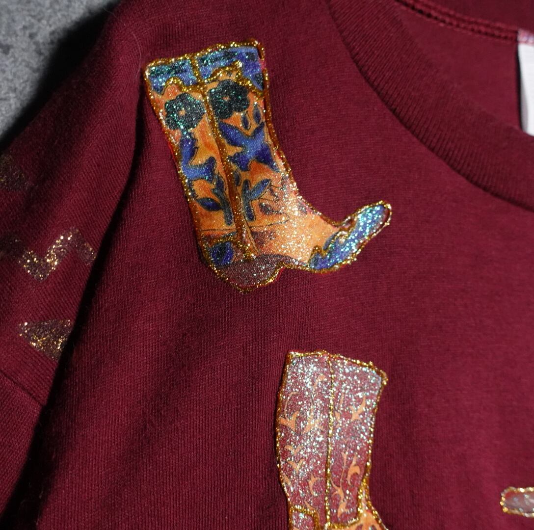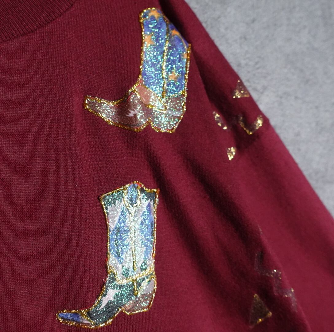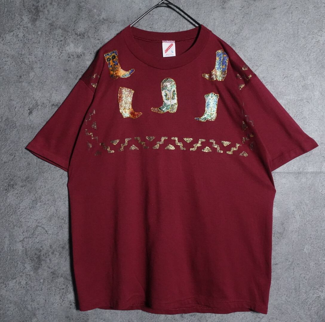 90s "JERZEEZ" Wine Red Western Boots Motif Print T-shir