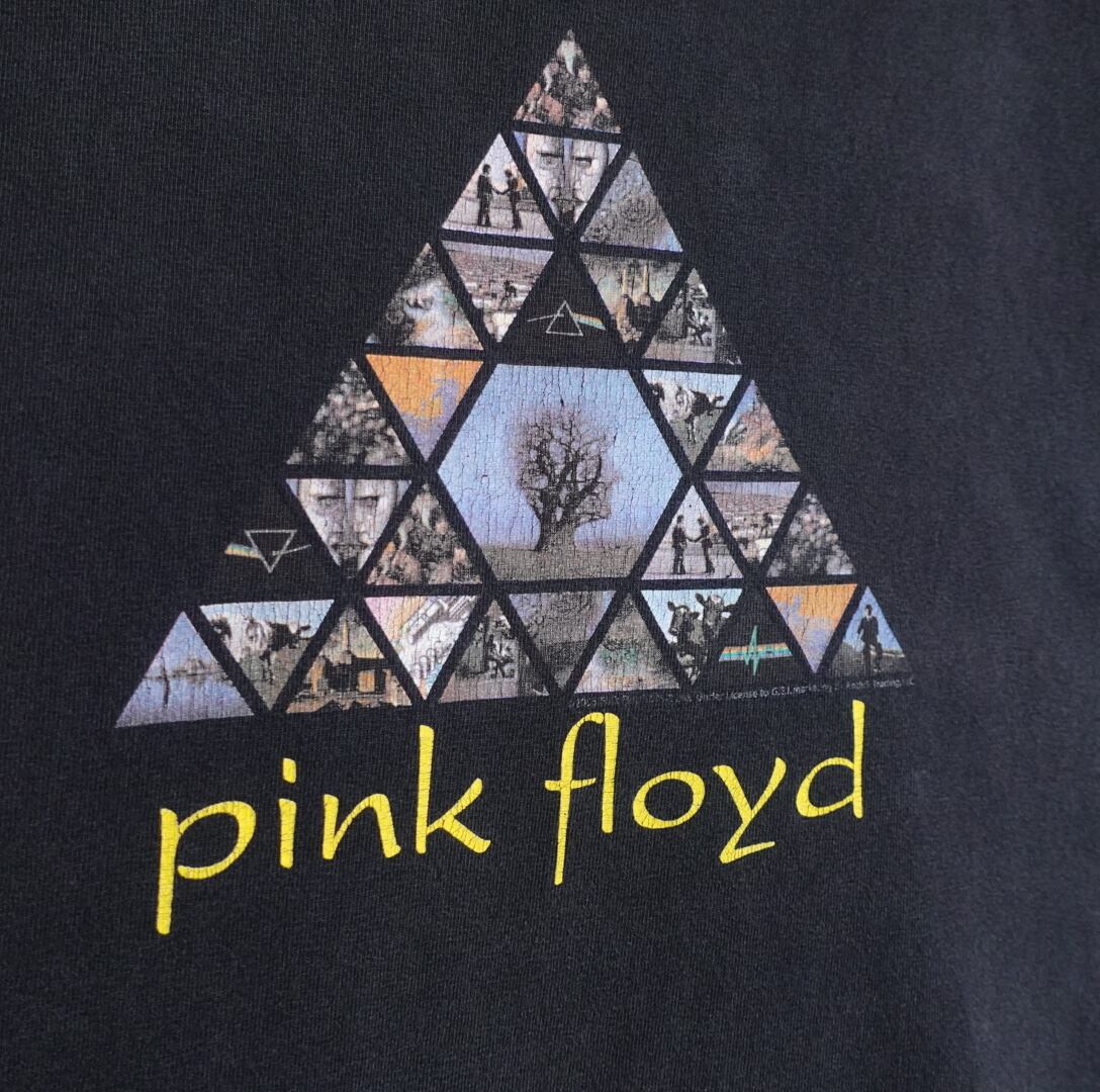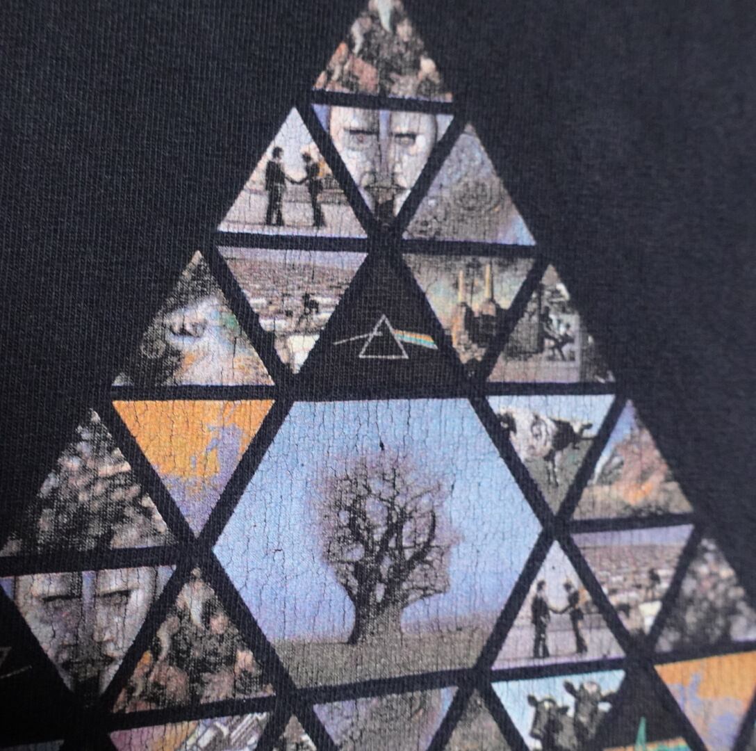 ブラックをベースにトライアングル状にPINK FLOYDの歴代のジャケ写とイエローのアルファベットのプリントを前面の中心部分にあしらった凝ったグッドプリントデザイン。