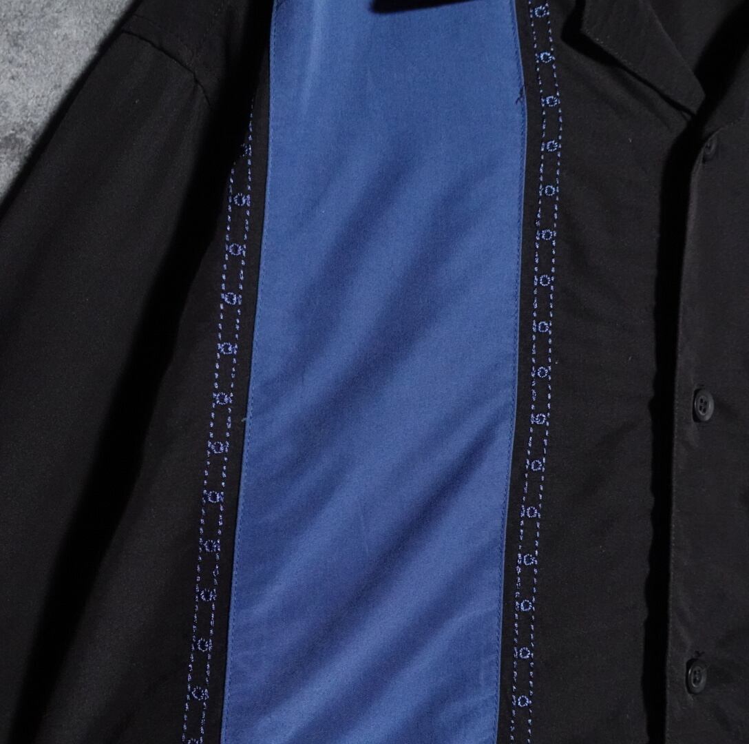 ブラックをベースにブルーのラインの左右に同色の幾何学的なモチーフ刺繍をライン状に施した洒落たデザイン。