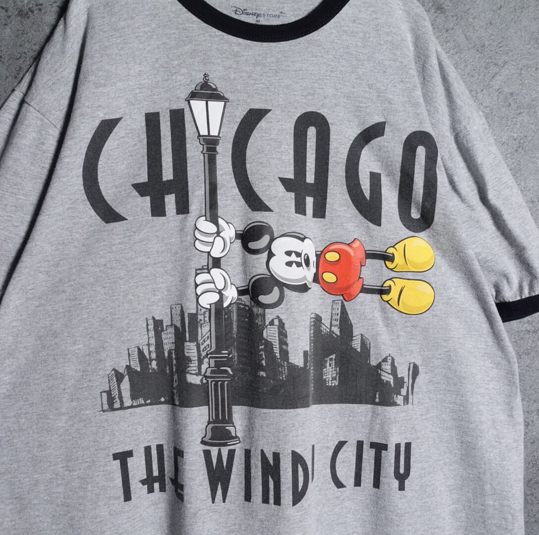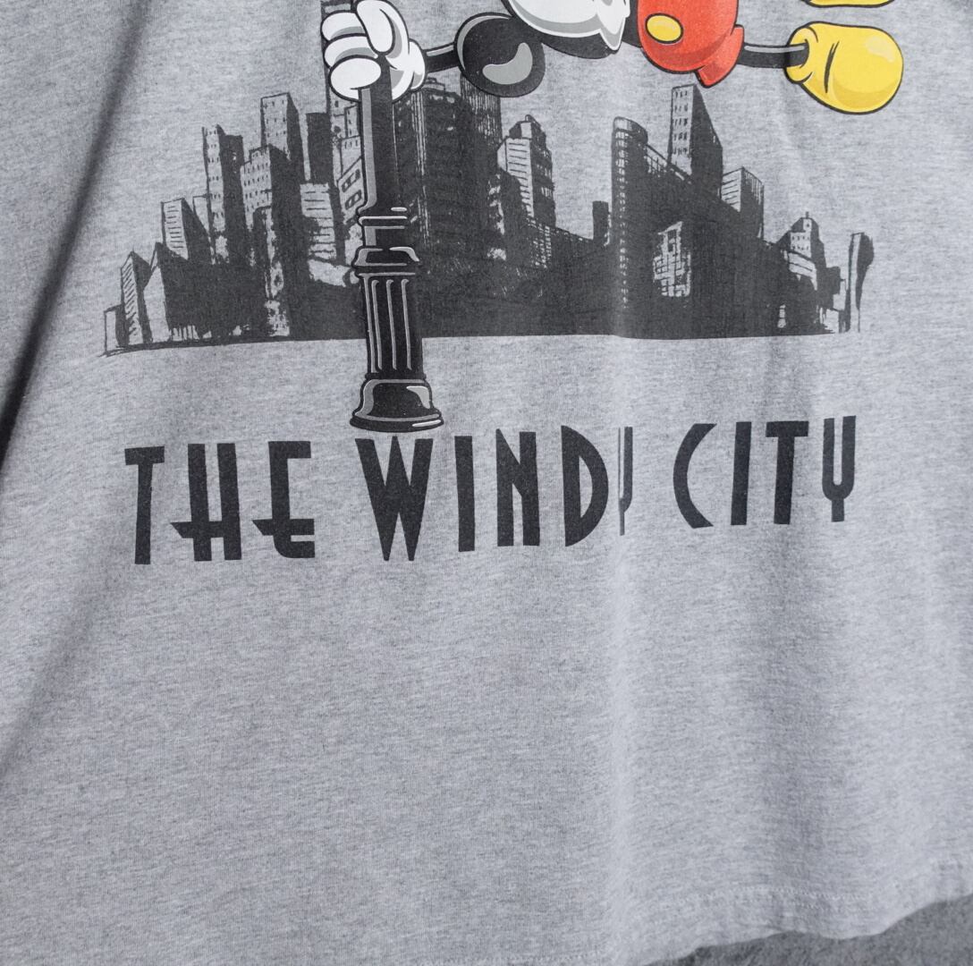 前面に街灯にぶら下がるミッキーとブラックのシカゴの街並み、アルファベットプリントをあしらったデザイン。