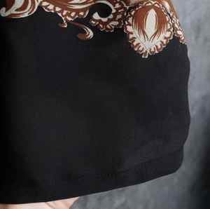 ブラックをベースにオレンジの花柄とブラウン、カーキ、オレンジの抽象的な柄のプリントを両面にあしらったデザイン。