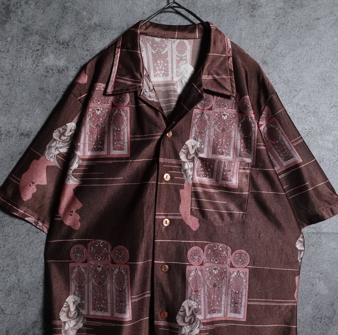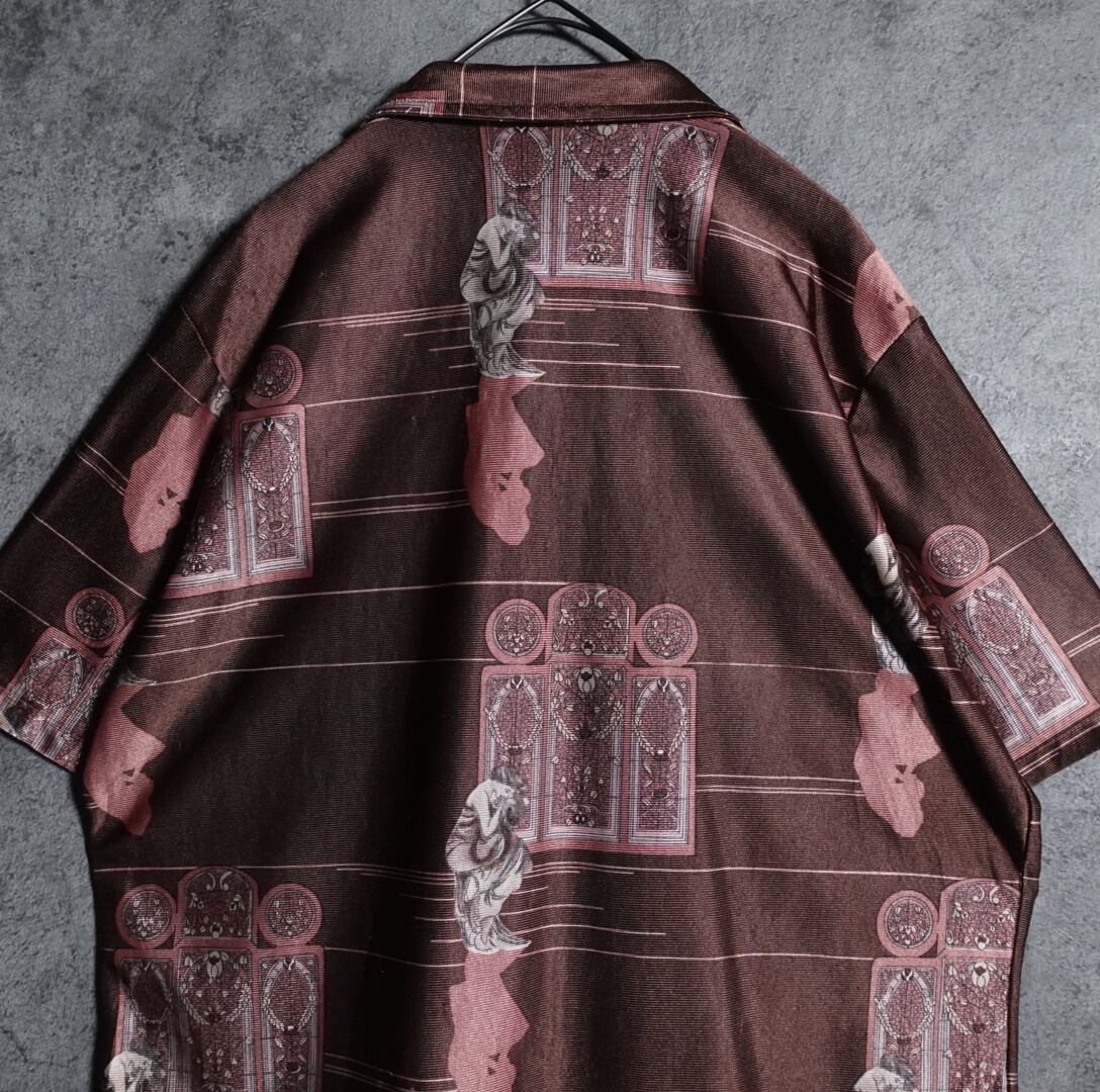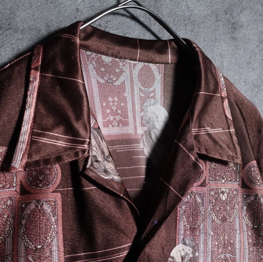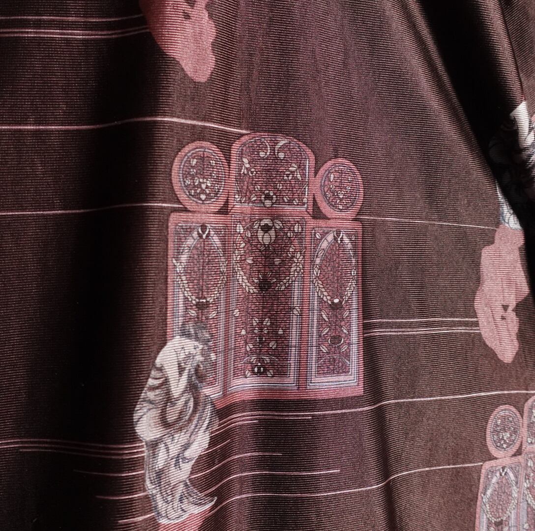 ブラウンをベースにステンドガラスと女神の像をモチーフをバラバラにあしらった希少なデザイン。