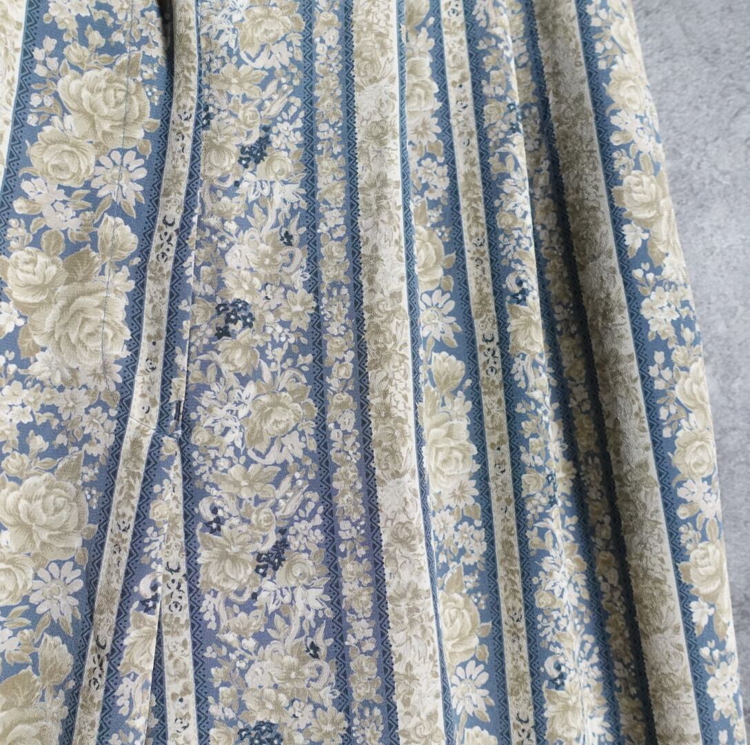 エメラルドブルーとベージュのストライプをベースに、大小様々な大きさの薔薇を全面にあしらった華やかなデザイン。