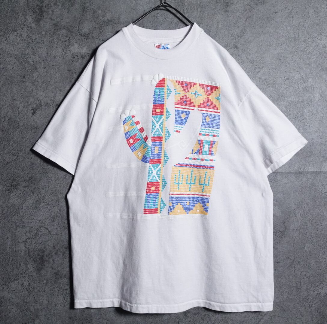 ホワイトをベースにレッド、ブルー、イエロー、グリーンのタイル調のプリントとサボテンのプリントを前面にあしらったデザイン。