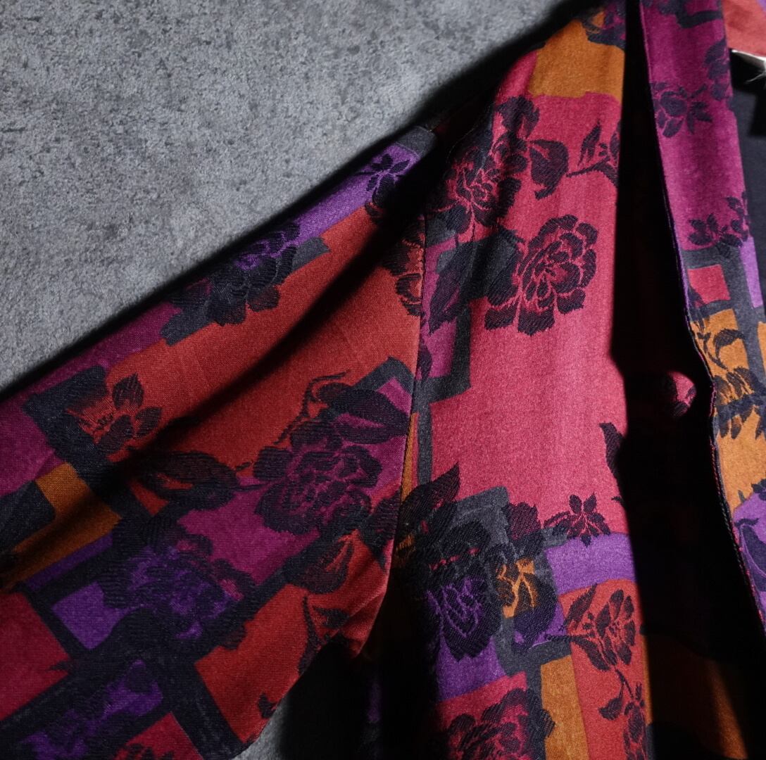 パネル状のプリントの上にブラックの花柄の刺繍を全面に施した洒落たデザイン。