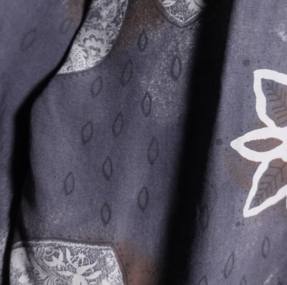 グレーをベースにアイボリーのペイズリー柄とボタニカルモチーフのプリントを全面にバラバラにあしらったデザイン。