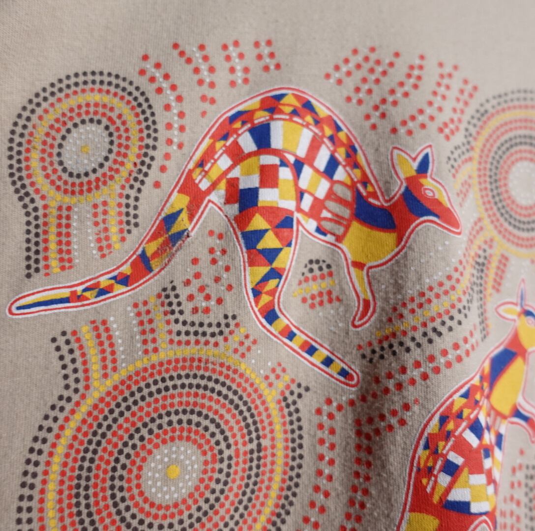 ベージュをベースに色鮮やかなレッド、ブルー、イエローのカンガルーをあしらったデザイン。