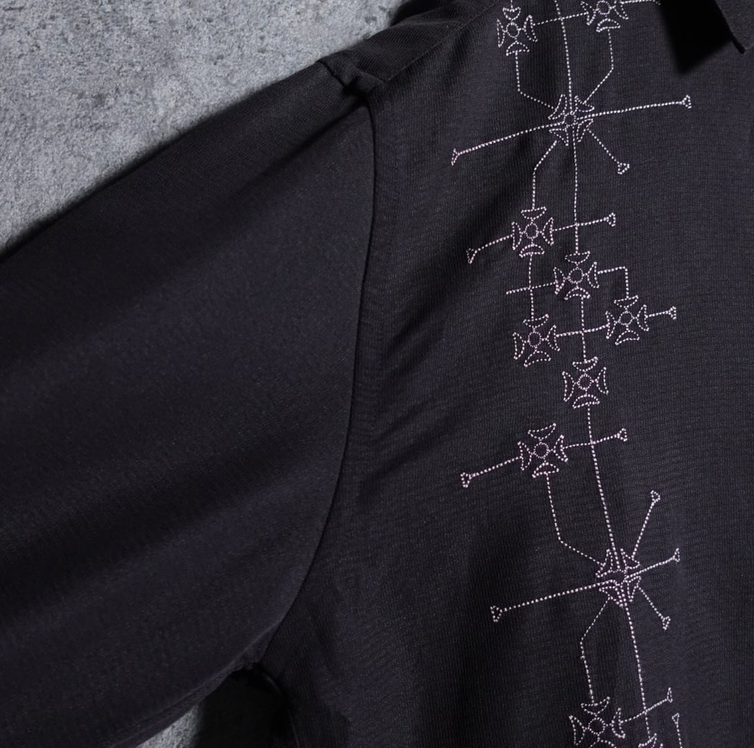 ブラックをベースにホワイトの抽象的な柄の刺繍を前面の左右にあしらったデザイン。