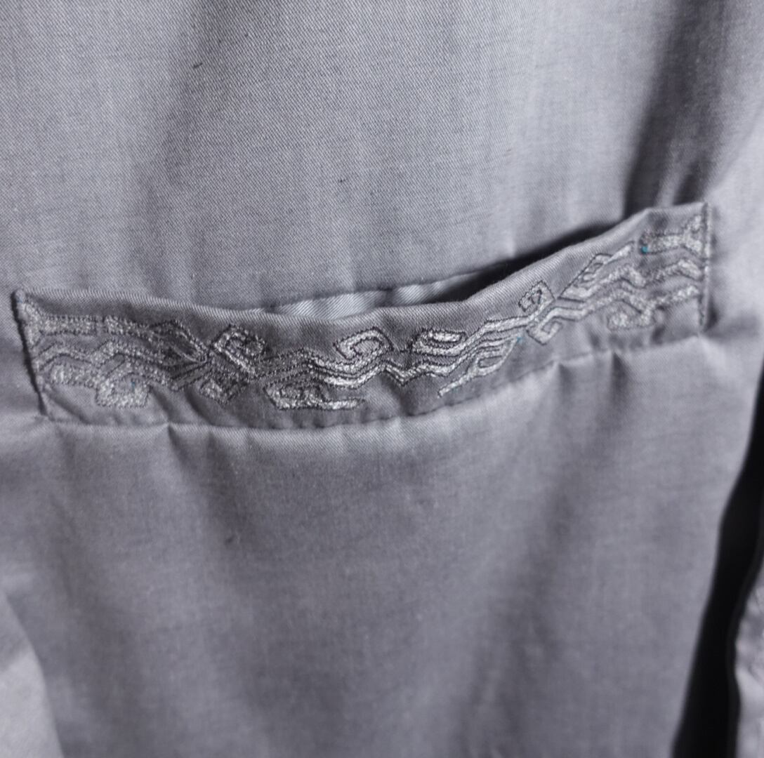 シルバーをベースポケット、袖先に、襟元、前立ての部分に抽象的な柄の刺繍を施したデザイン。