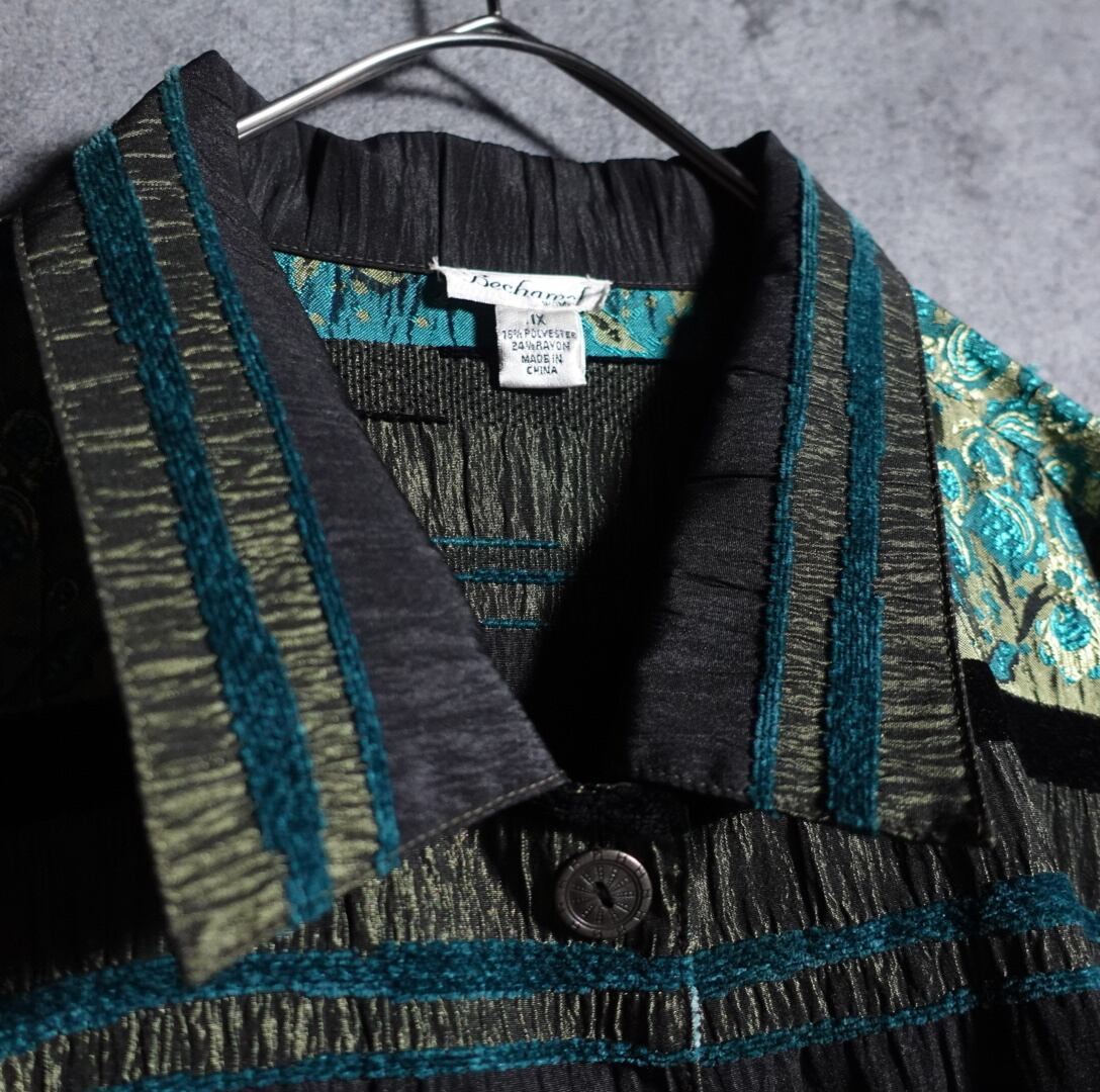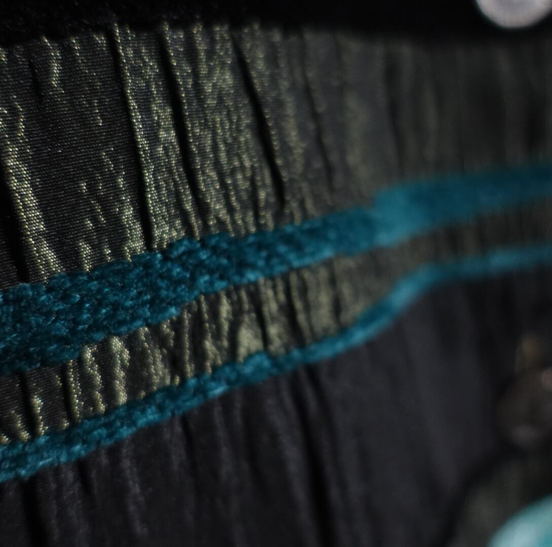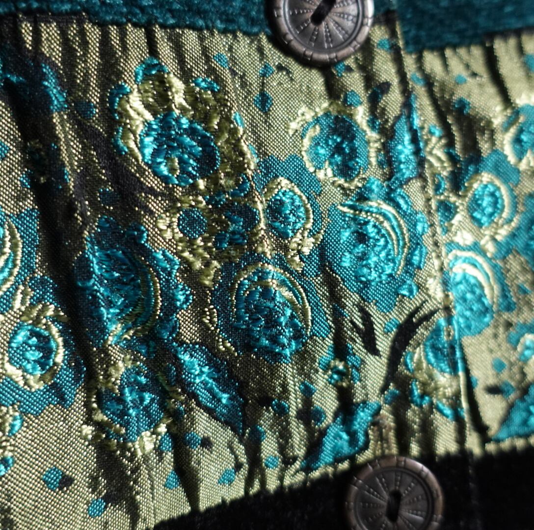 グリーン、ブラックの同系色の花モチーフやシワ加工の入った生地、ベロア生地など様々な柄、生地をボーダー状に切替えた凝りに凝ったスペシャルなデザイン。