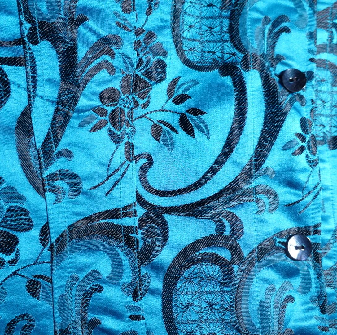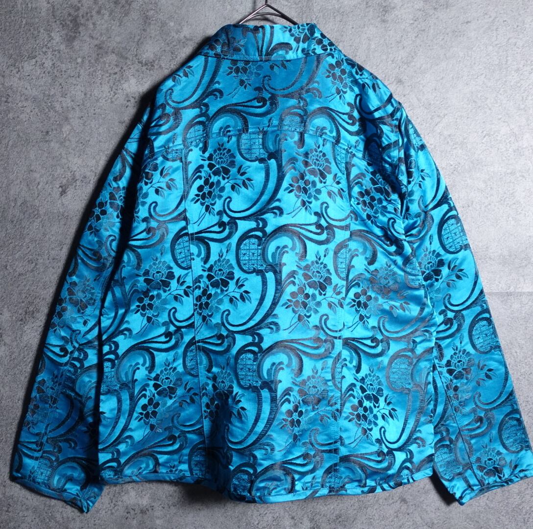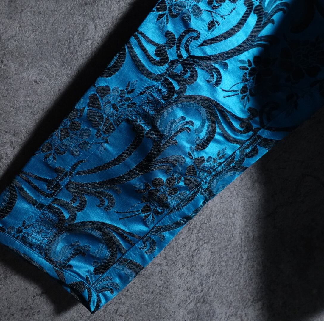 ライトブルーをベースにブラックの花柄と抽象的な柄の刺繍を全面にあしらったデザイン。