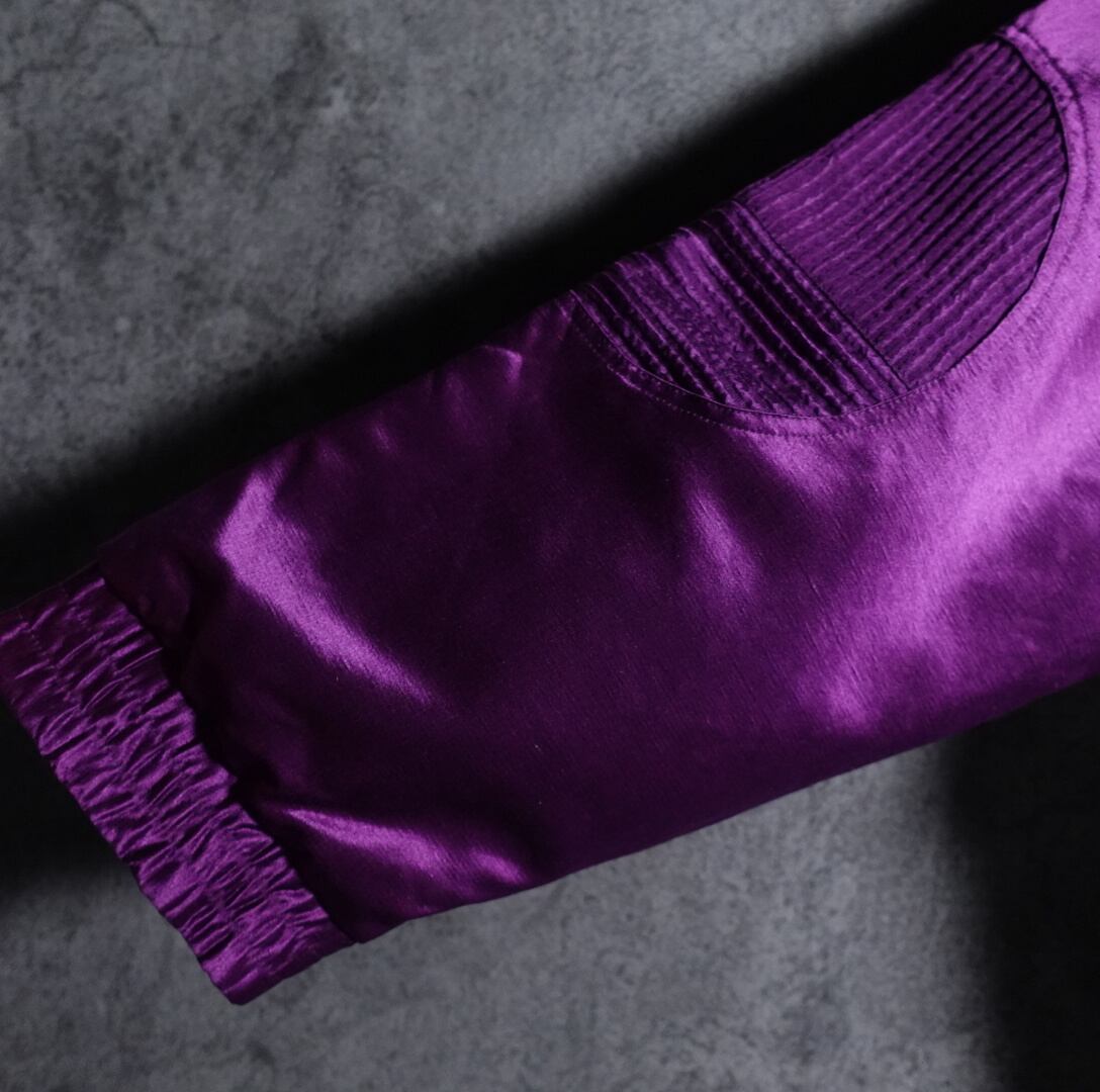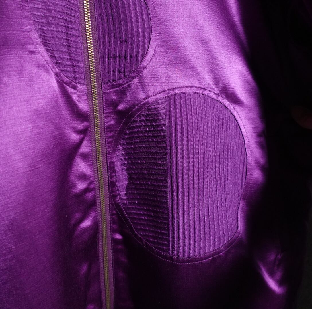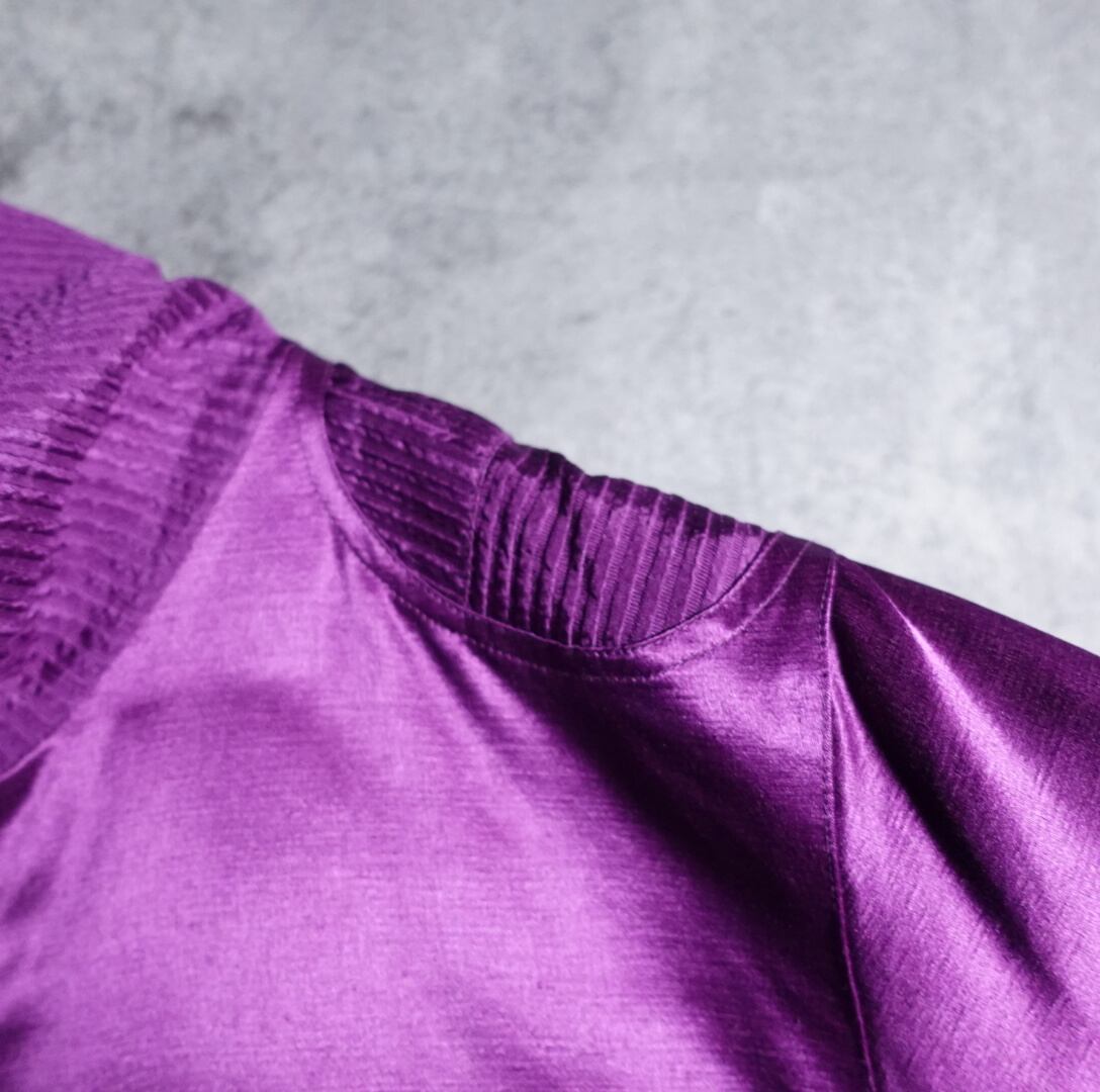 パープルをベースに両袖、左肩、襟元、前面の右斜めに円状のプリーツを施した珍しいデザイン。