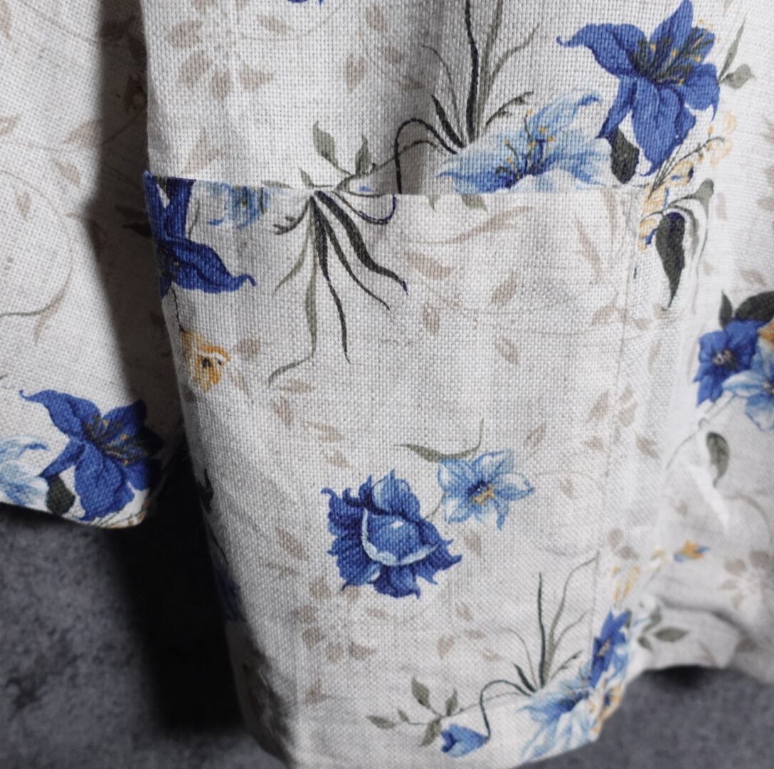 アイボリーをベースにブルー、ライトブルー、イエローの花柄を全面にあしらった華やかなデザイン。