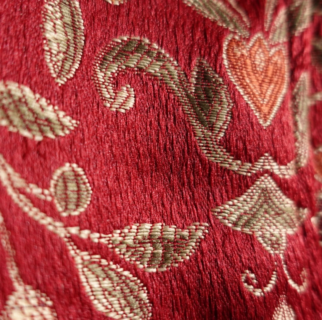レッドをベースに花のモチーフを全面にあしらった華やかなデザイン。