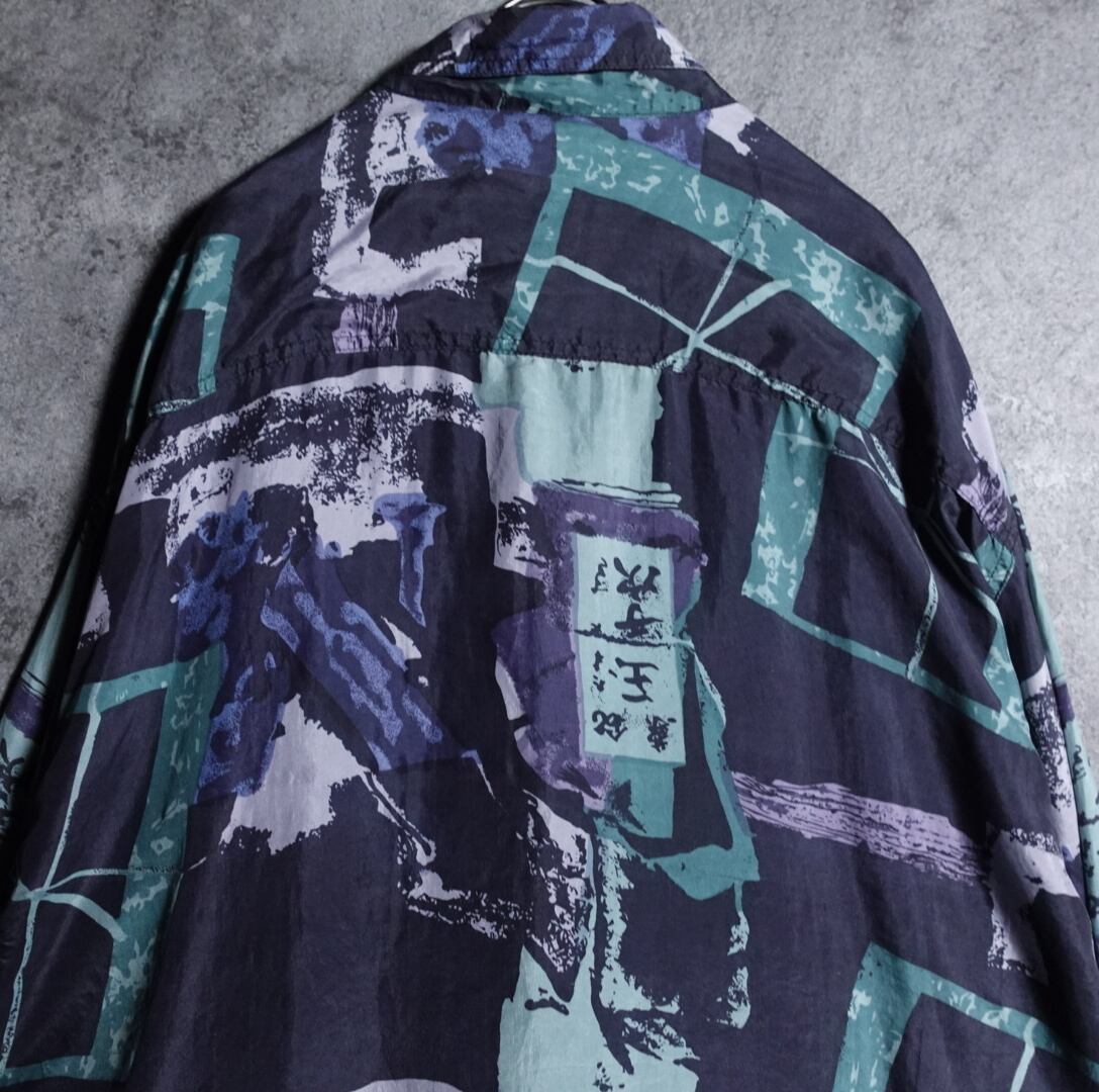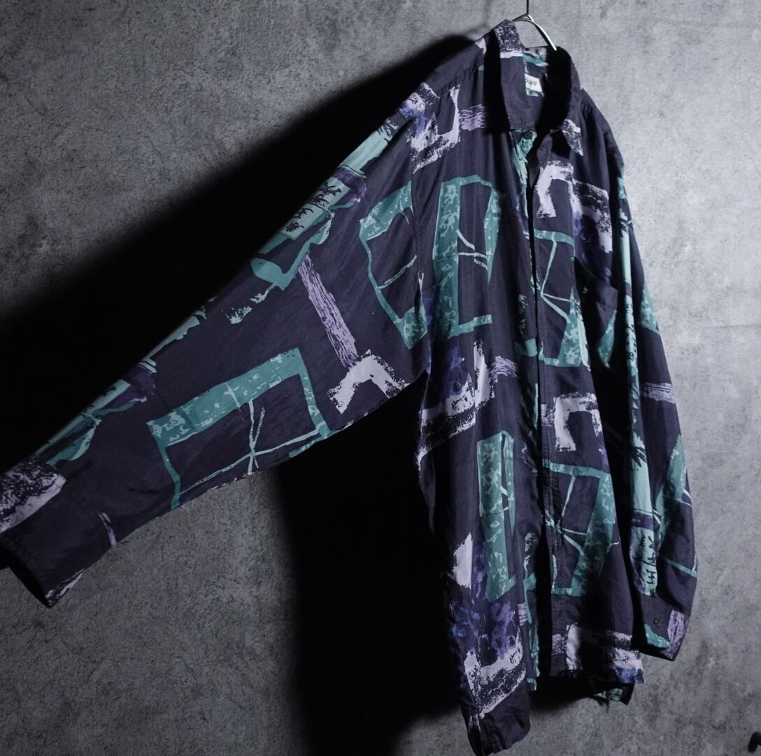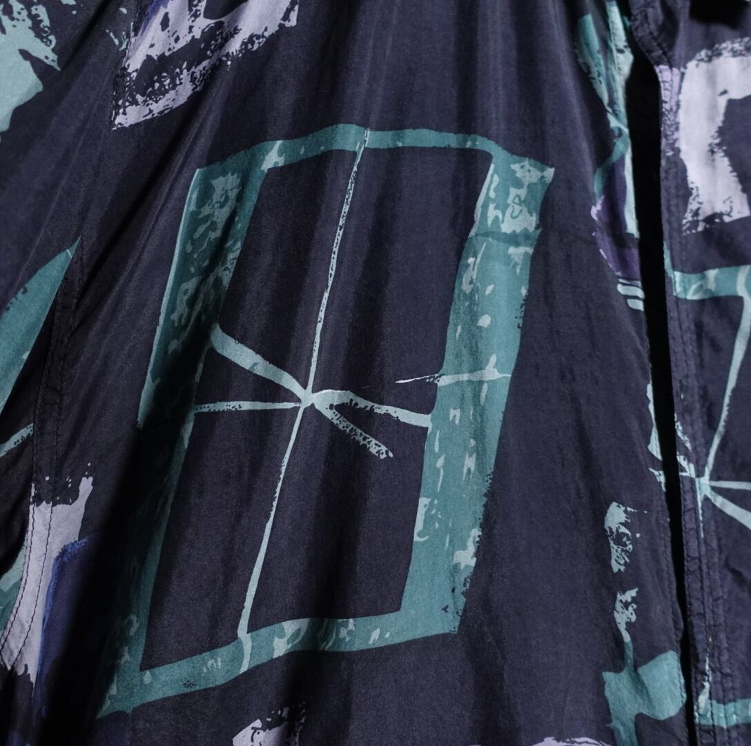 絶妙な色味のブルーブラックをベースにグリーン、ブルー、ホワイトの抽象的な柄を全面にあしらったアーティスティックなデザイン。