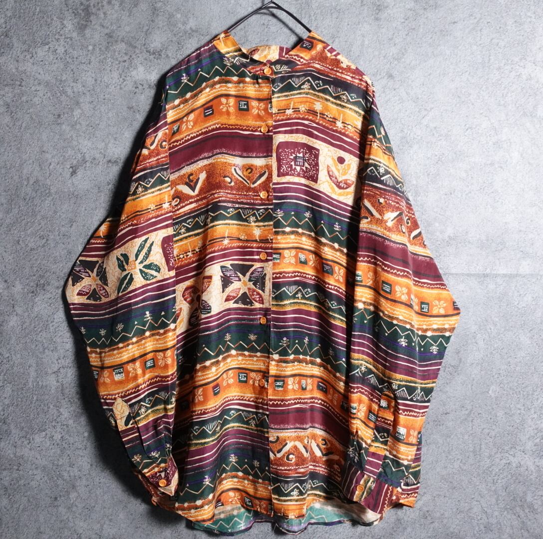 柄シャツには珍しいバンドカラーでスッキリとした印象で◎