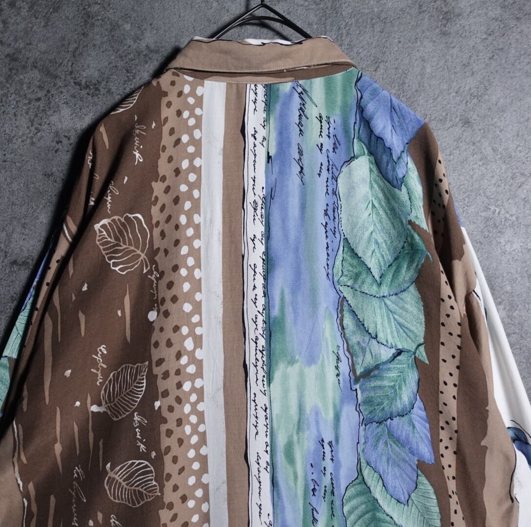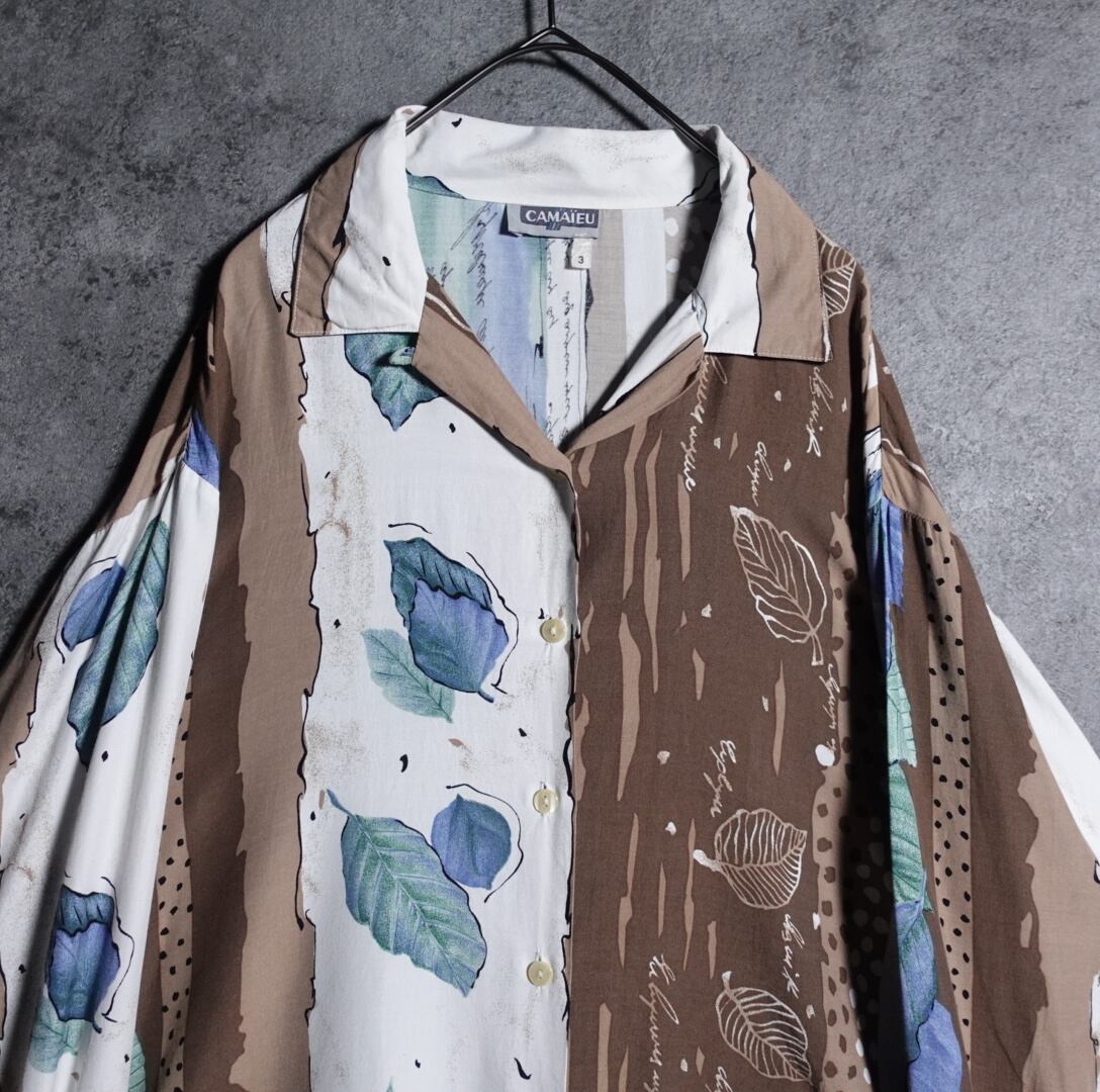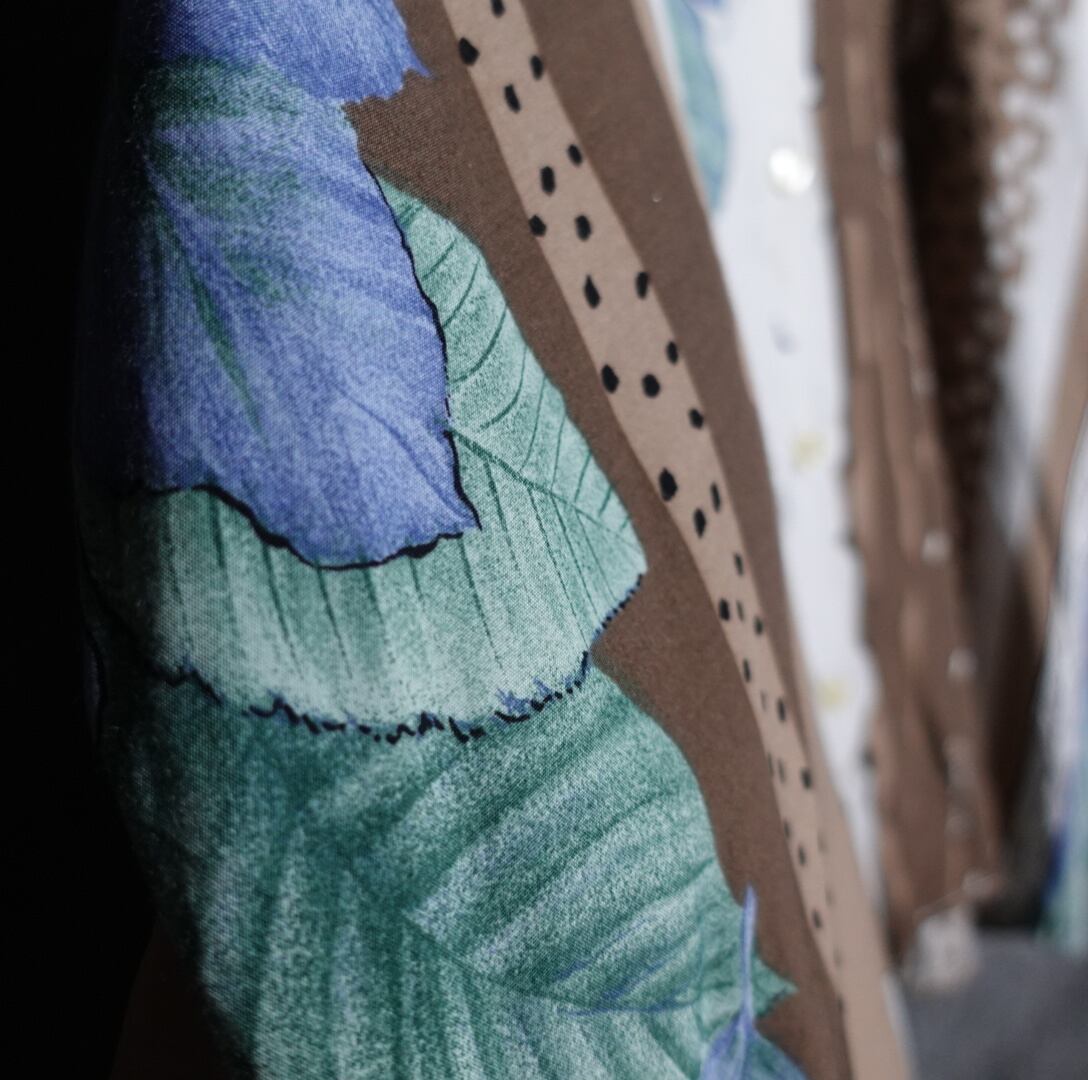 リーフモチーフをそれぞれ違ったタッチ、サイズ、カラーリングでストライプ状にあしらった洒落たデザイン。