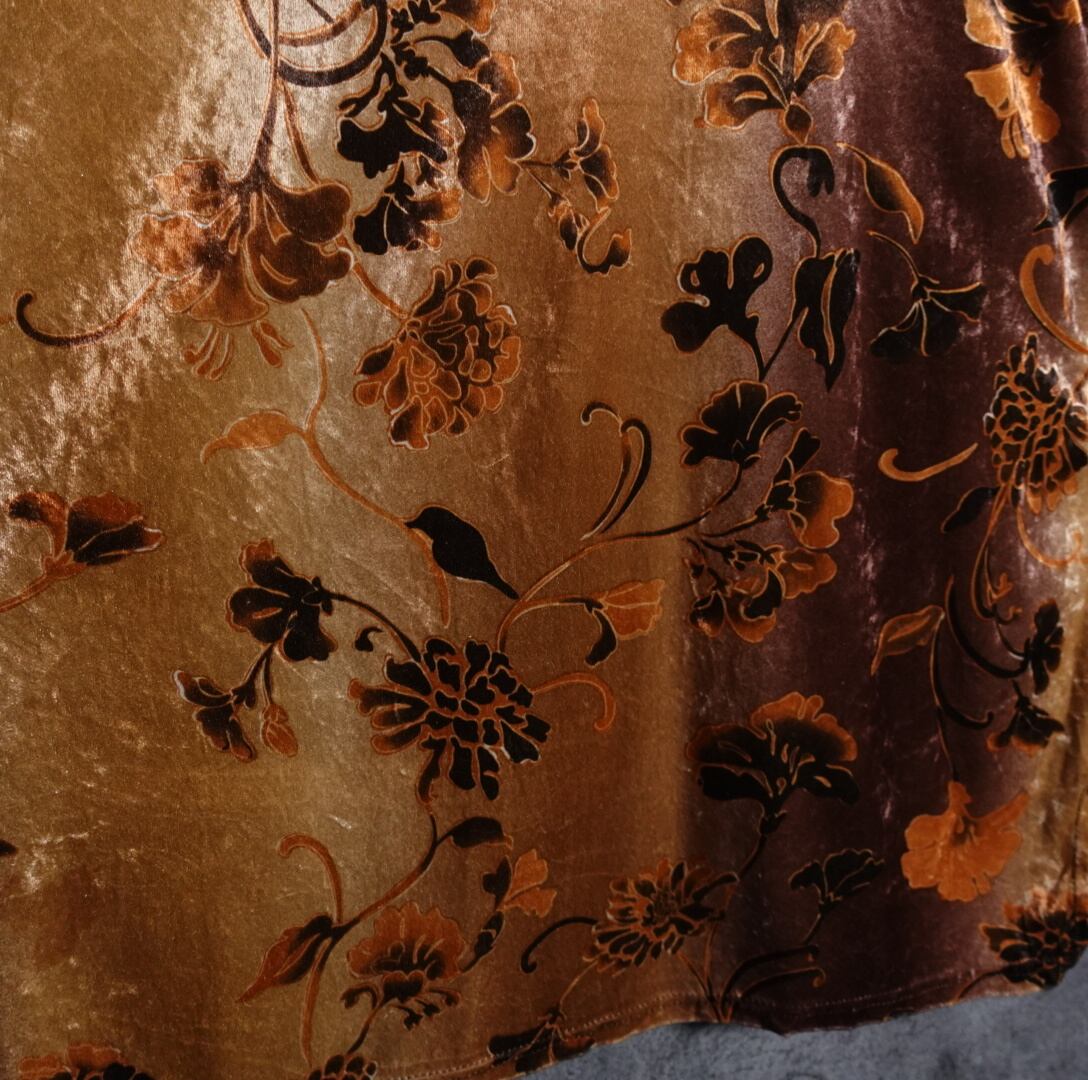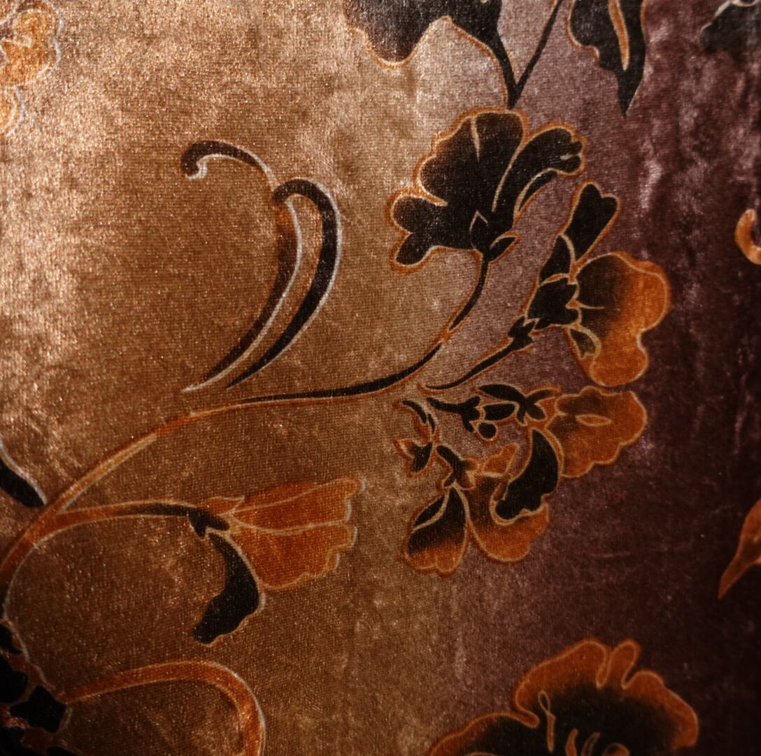 グラデーションがかったベージュ、ブラウンをベースにフラワーモチーフを全面にあしらった洒落たデザイン。
