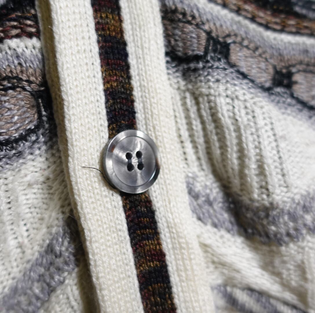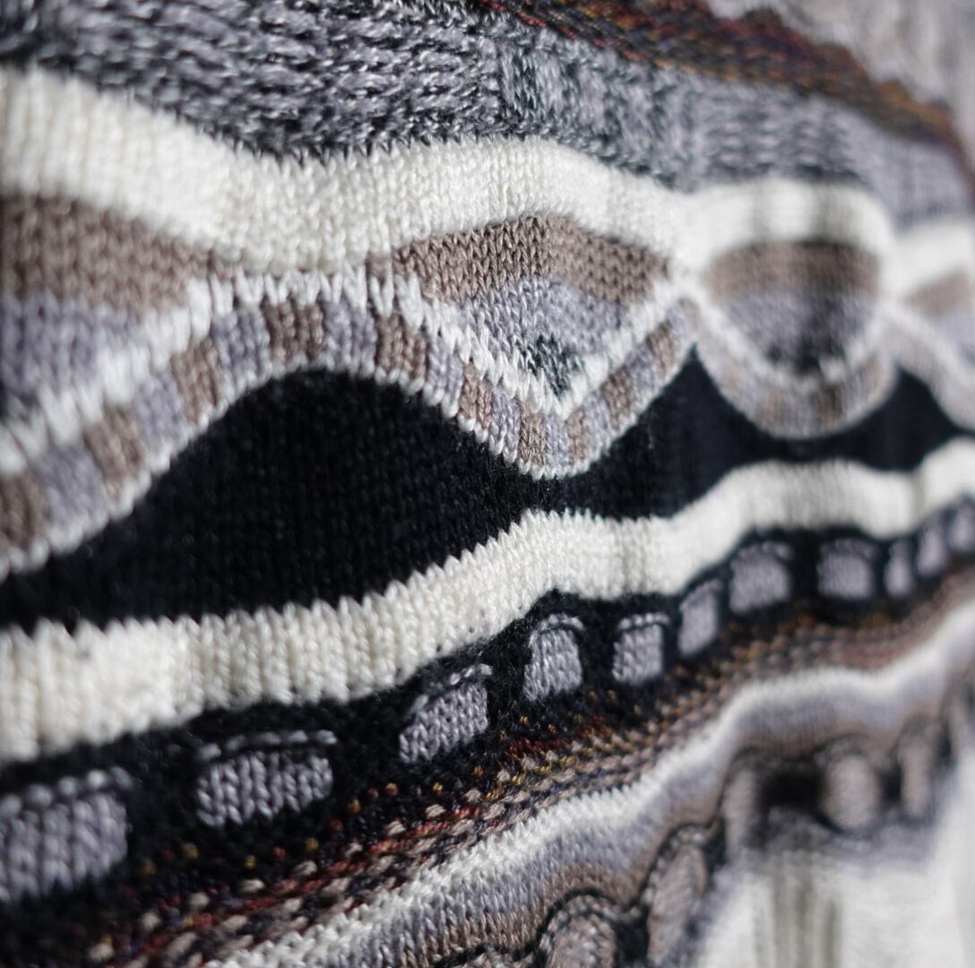 様々な立体感のある編み方で表現された3D仕様の柄をボーダー状に全面にあしらったデザイン。