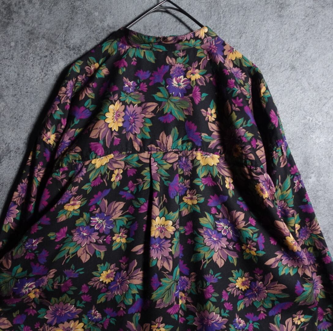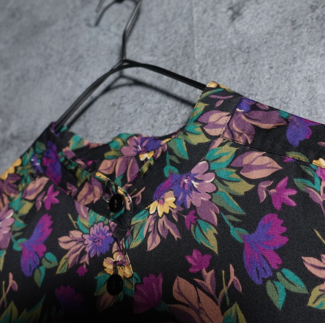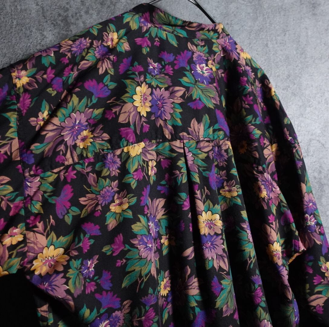 ブラックをベースにパープル、イエロー、グリーンの花々を全面にあしらったデザイン。