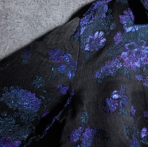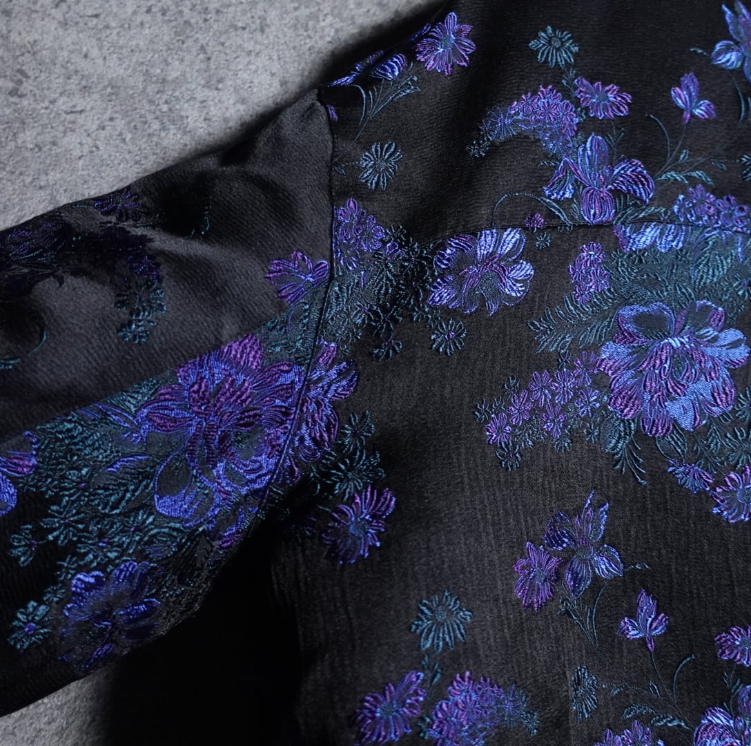 ブラックをベースにブルー、パープル、グリーンの花柄とボタニカルを全面にあしらったデザイン。
