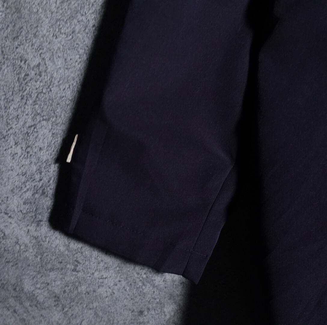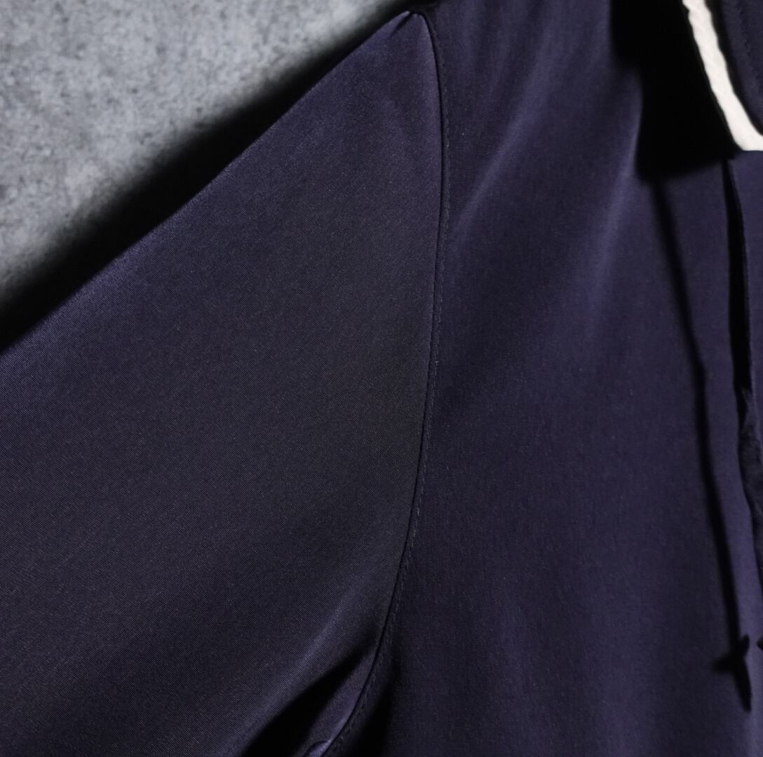 素材はポリエステル100%で上品な光沢感がありサラッとした生地感です。ある程度水を防いでくれるので今の悪天候な季節にも活躍してくれます。