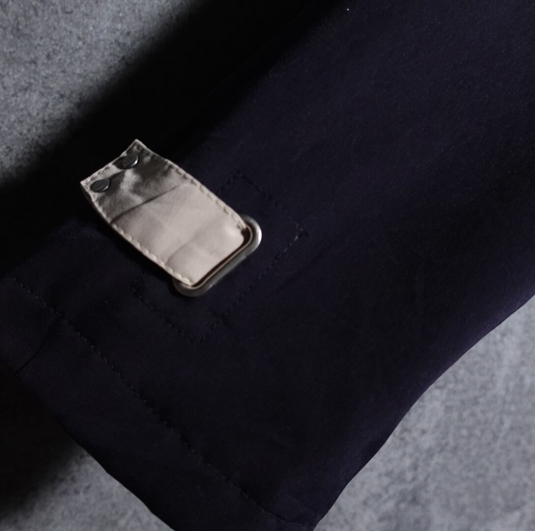 ネイビーをベースにドローコード、ボタンにシルバーを施した洗練されたモードなデザイン。