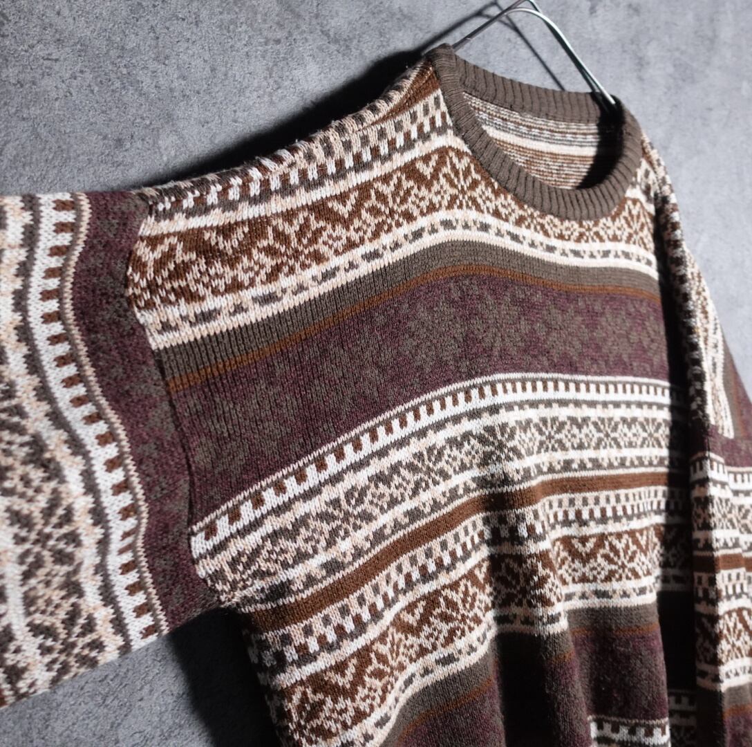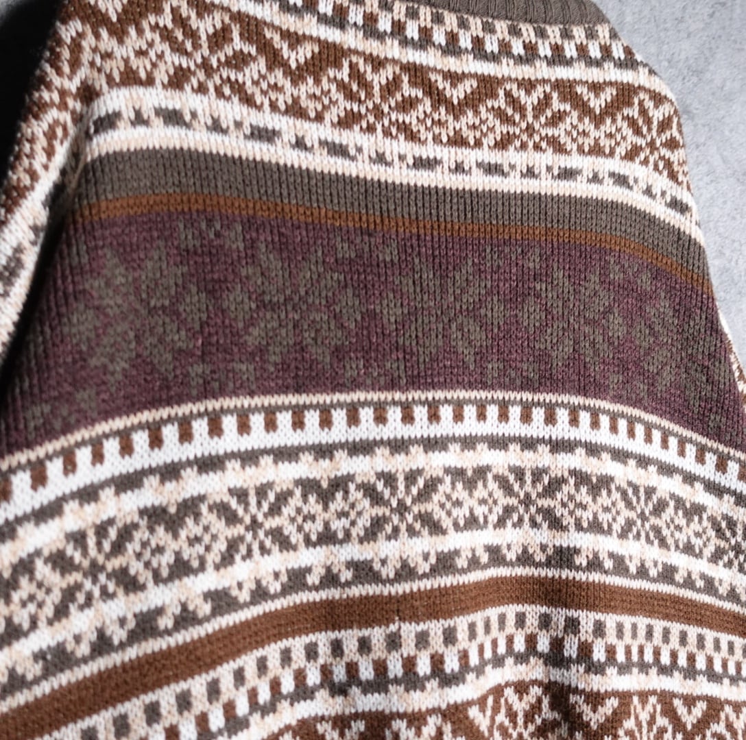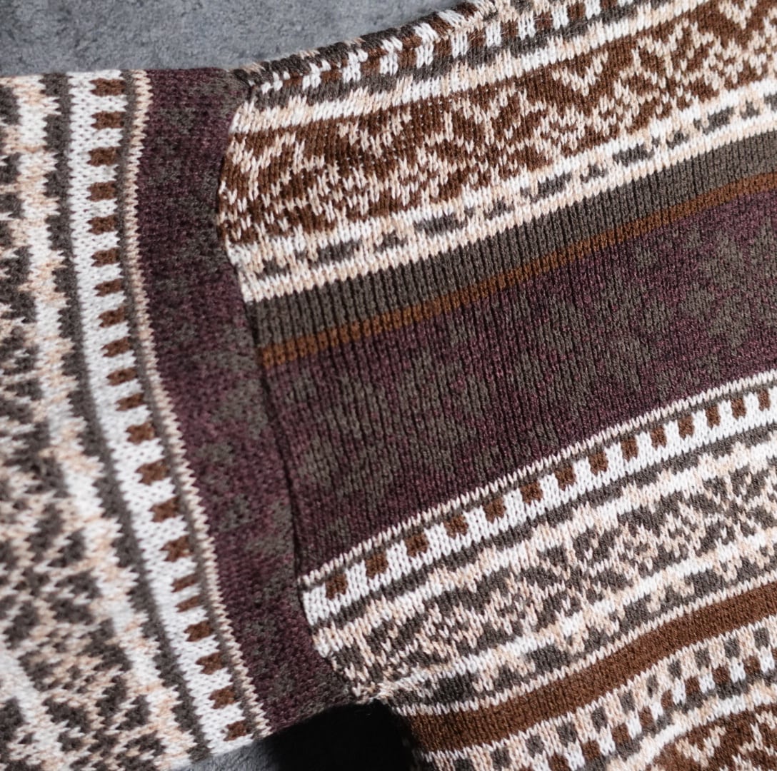 ブラウン、ワインレッド、ホワイト、カーキ、ベージュのアーガイル柄ボーダー状にを全面にあしらったデザイン。