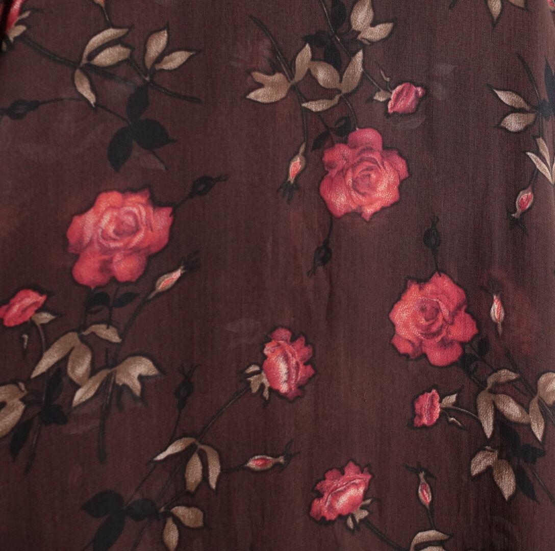 ブラウンをベースにレッドのバラとカーキ、ブラックの薔薇のモチーフをあしらったデザイン。