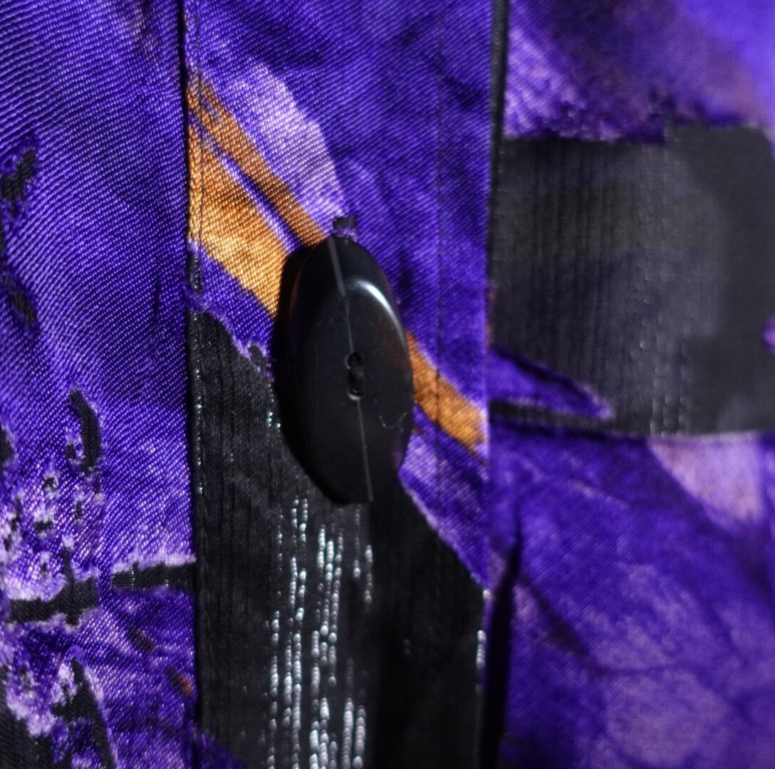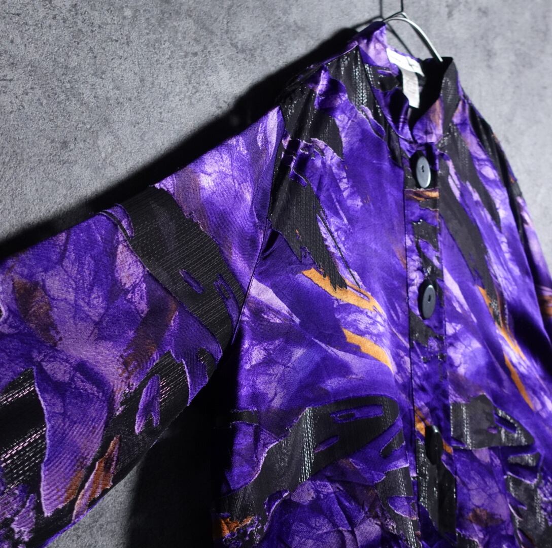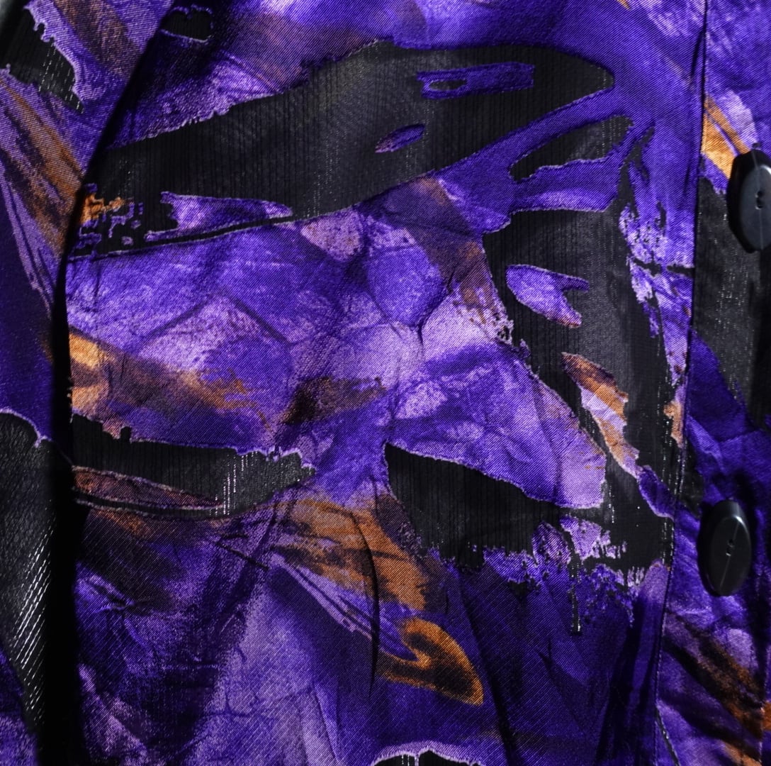 パープル、ゴールド、ホワイト、ブラックの抽象的な柄を全面にあしらったデザイン。