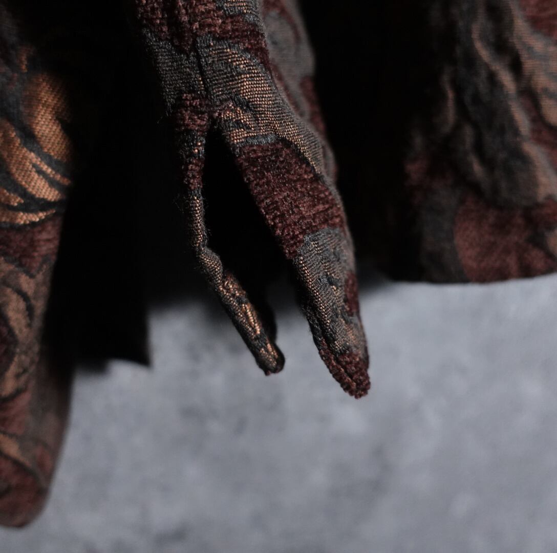 ブラウンをベースにベージュ、ブラウンの光沢感のある生地でボタニカルモチーフを全然にあしらった凝ったで。