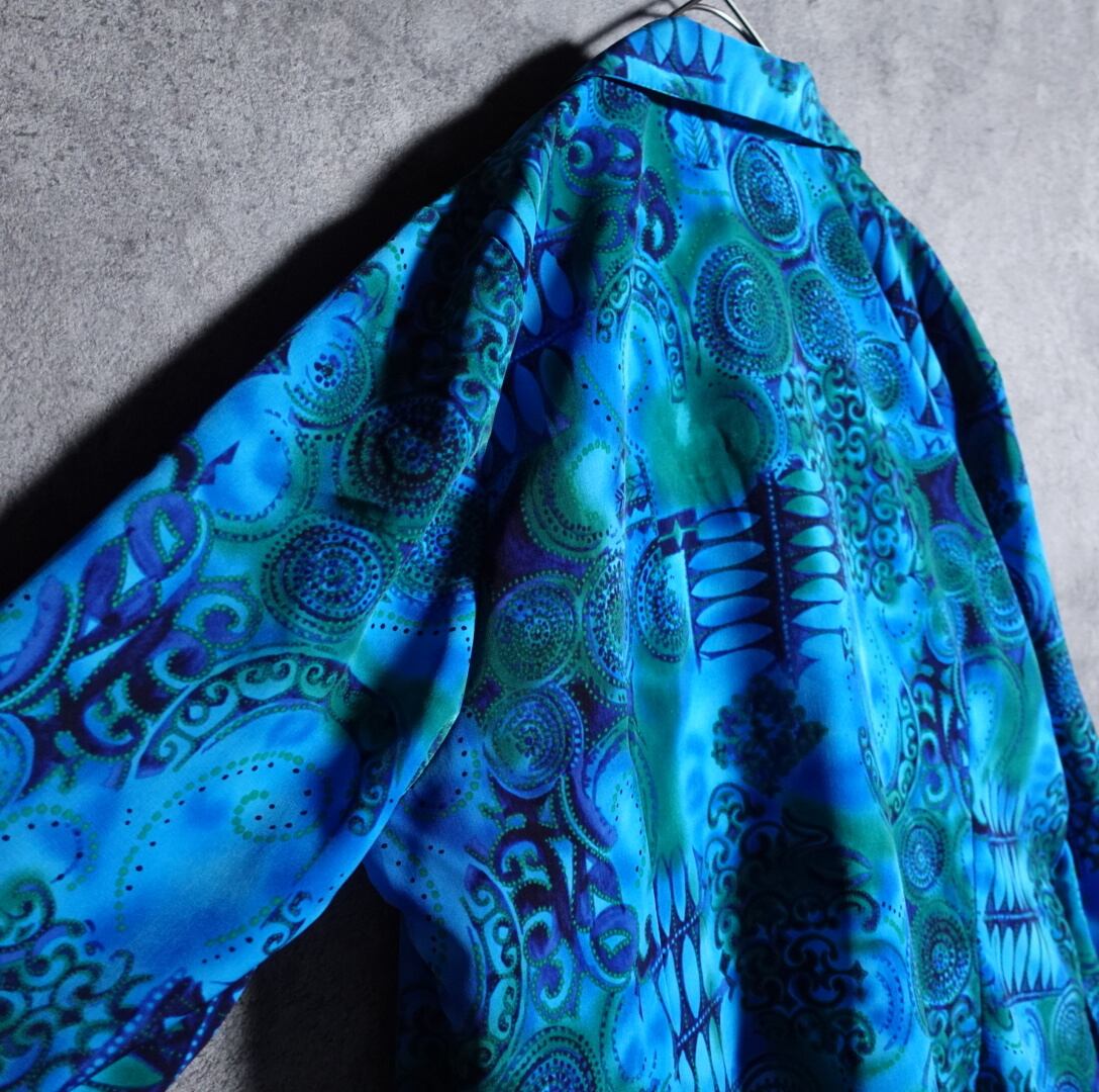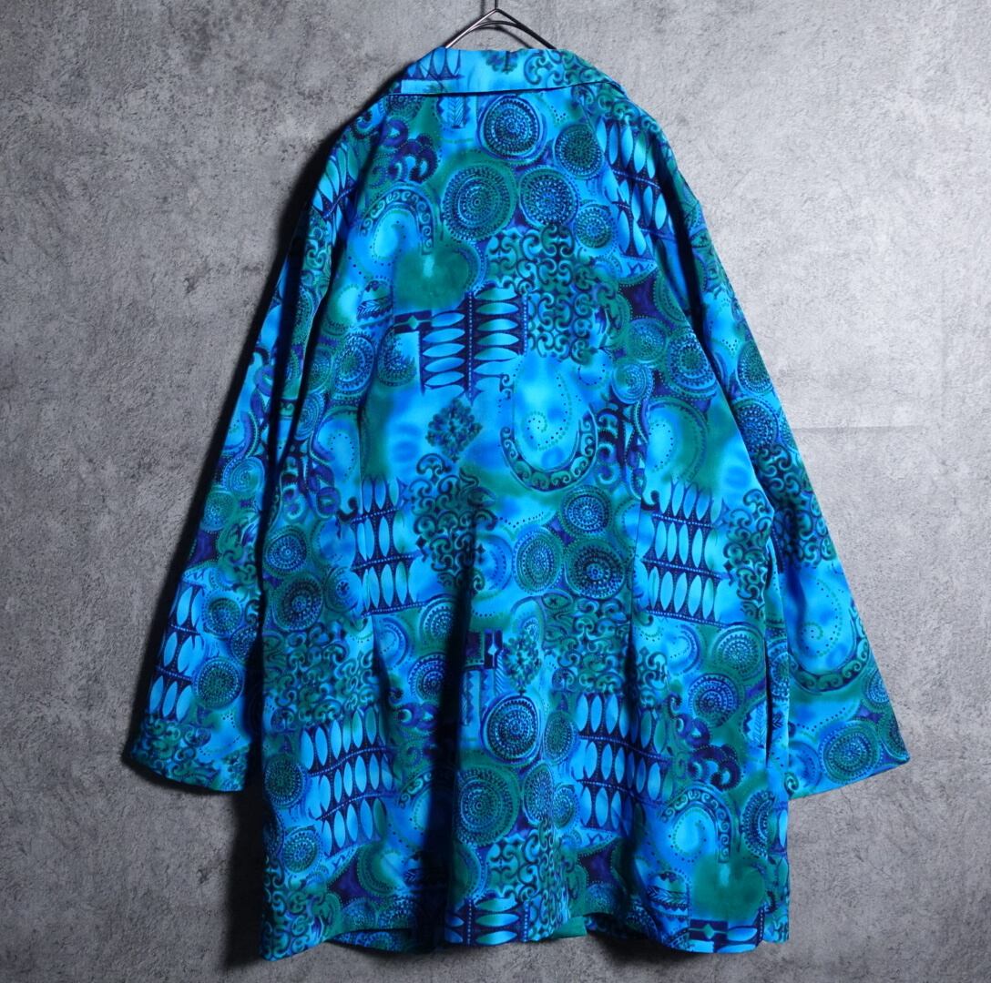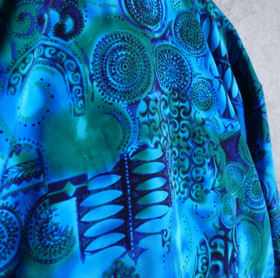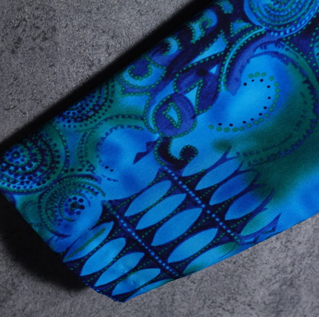 ブルー、グリーン、ネイビーの抽象的な柄を全面にあしらったアーティスティックなデザイン。