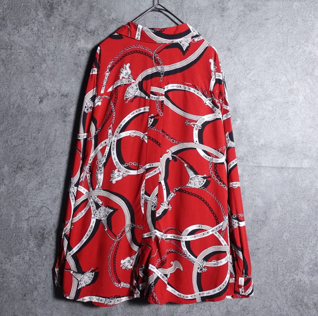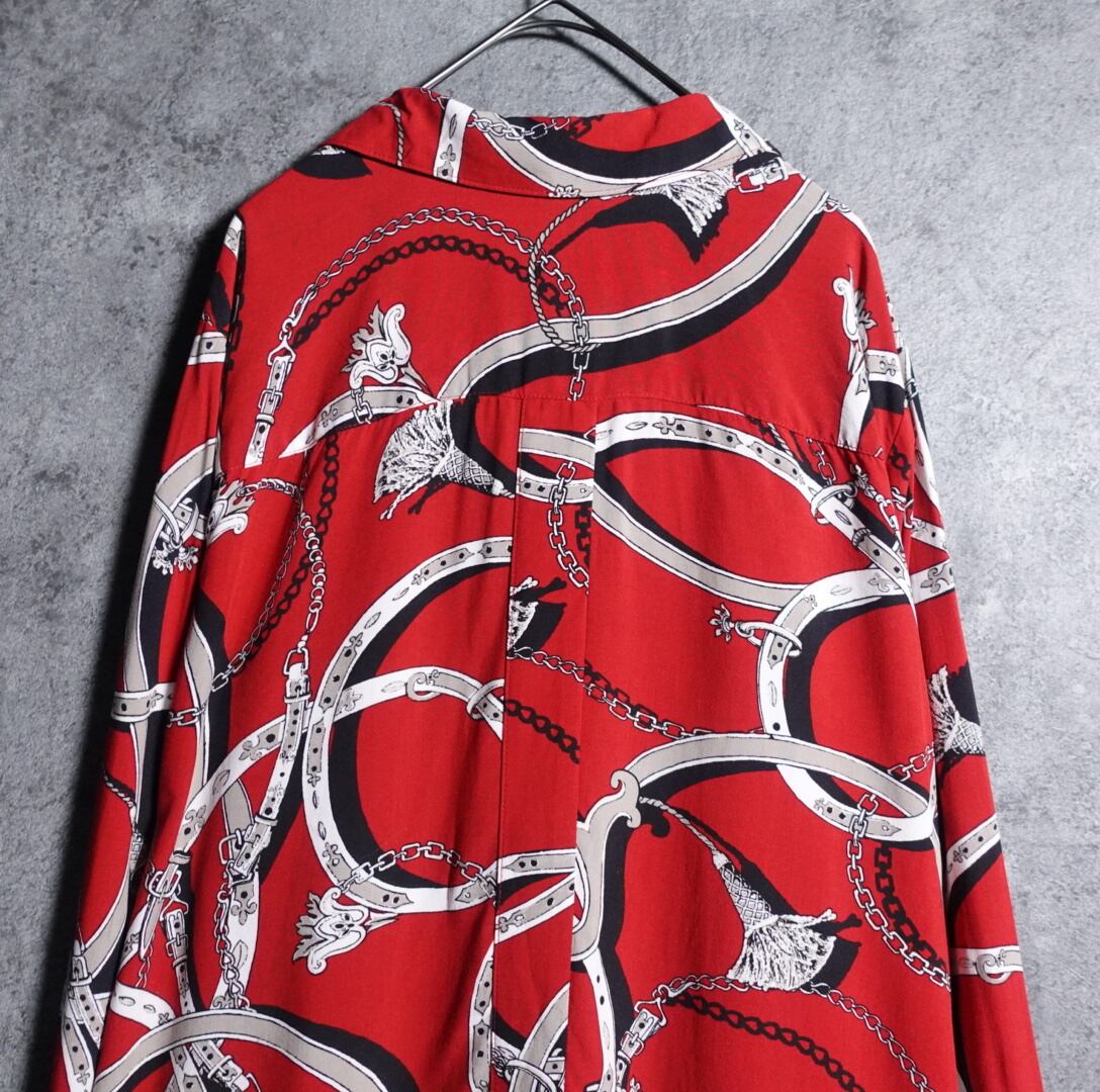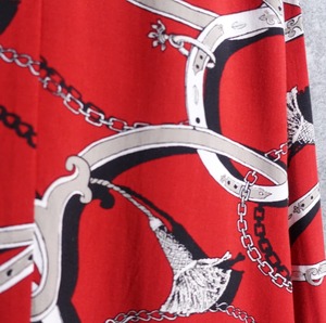 レッドをベースに鎖やベルトのモチーフを全面にあしらったクールなデザイン。