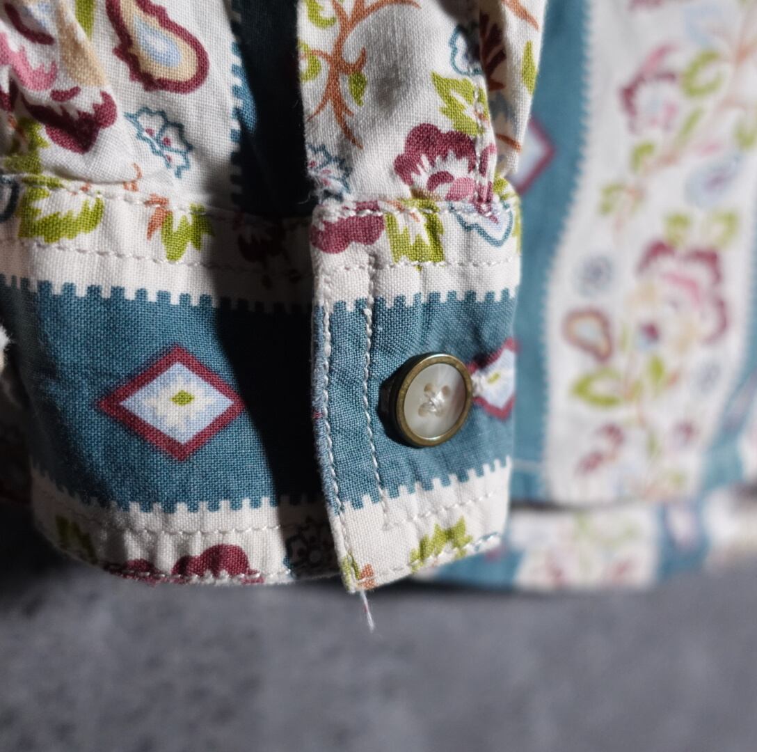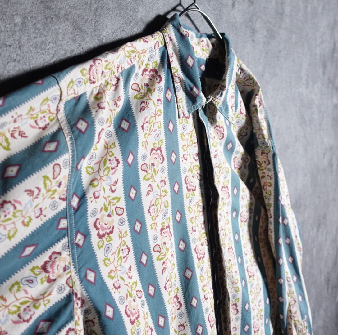 花柄と幾何学模様をストライプ状に全面にあしらったデザイン。