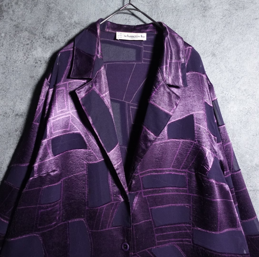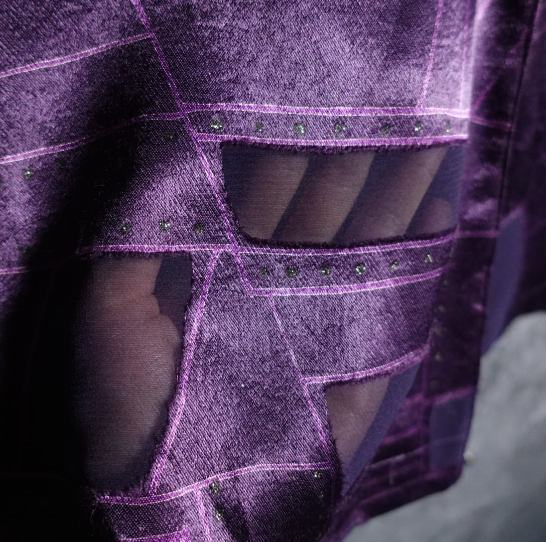 パープルをベースにシアー生地と光沢感のある記事をパネル状にバラバラにあしらったデザイン。